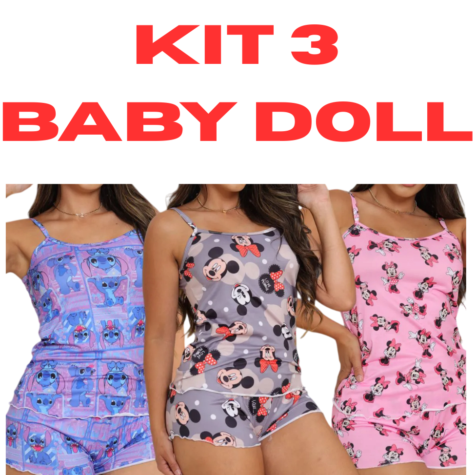 Kit 3 Conjunto Pijama Baby Doll MICRO Short Doll Estampado Sem Bojo Original Fresquinho