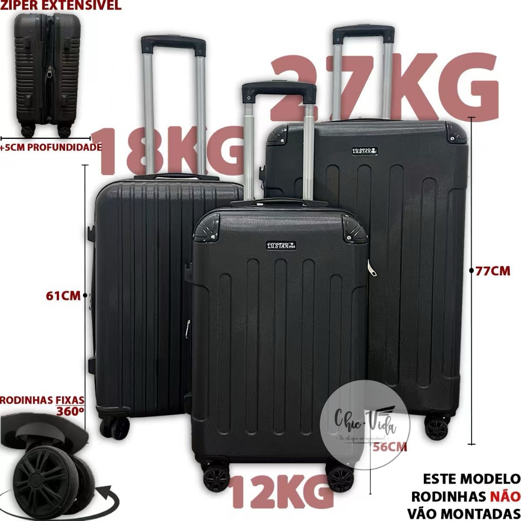 Kit 3 Malas De Viagem 23KG + 18KG+ 10KG Mala Despachada + De Bordo ABS Roda Dupla Com Senha Promoção