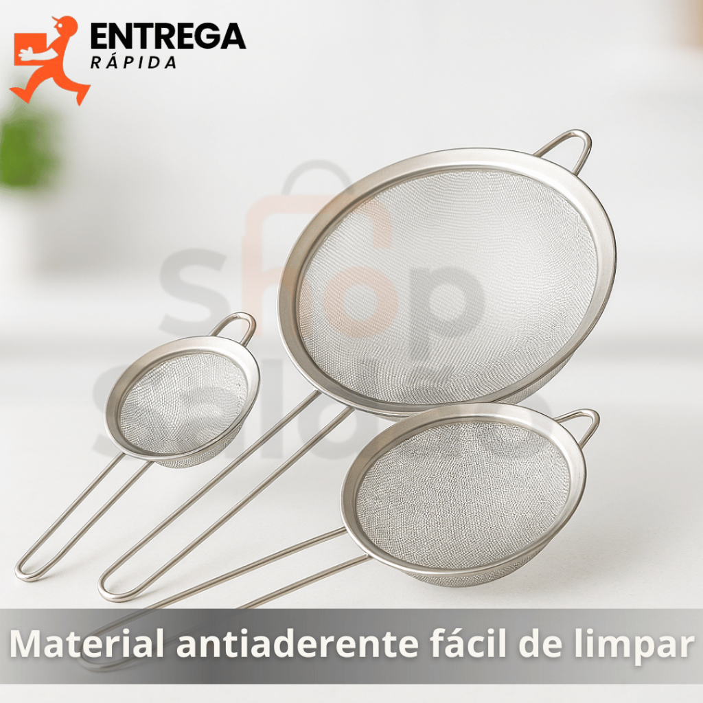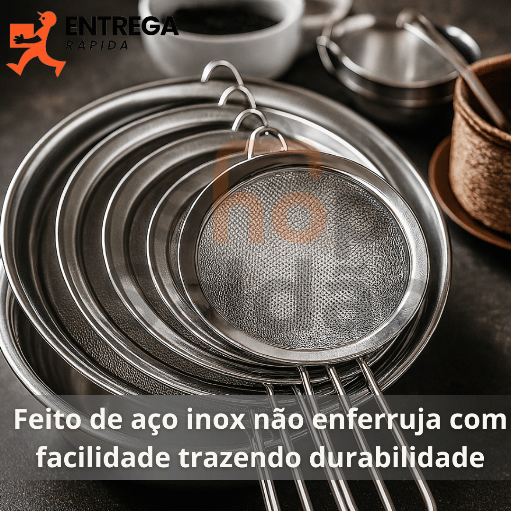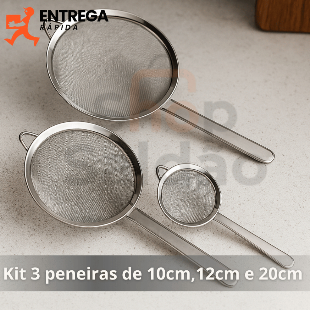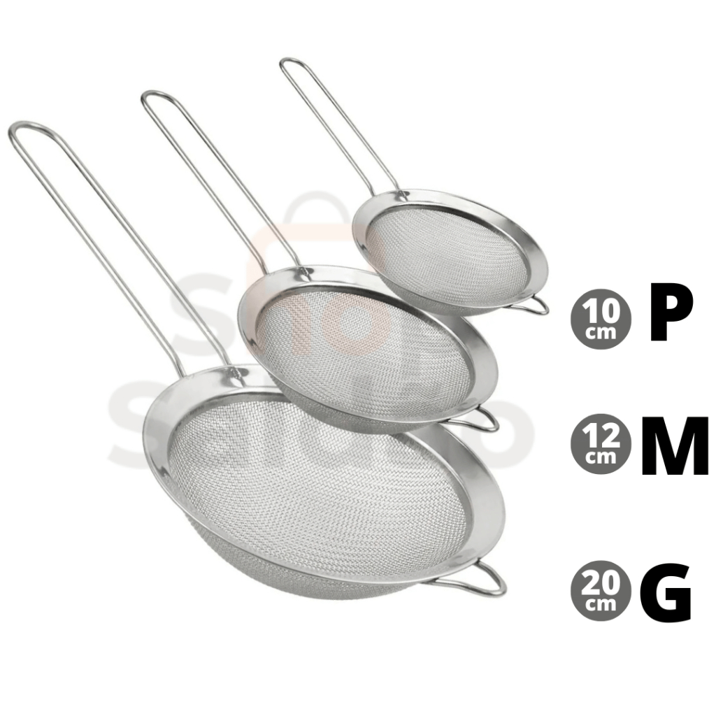 Kit 3 Peneira de Cozinha Aço Inox 10cm 12cm e 20cm Utensílios Grande para Confeitaria e Tapioca