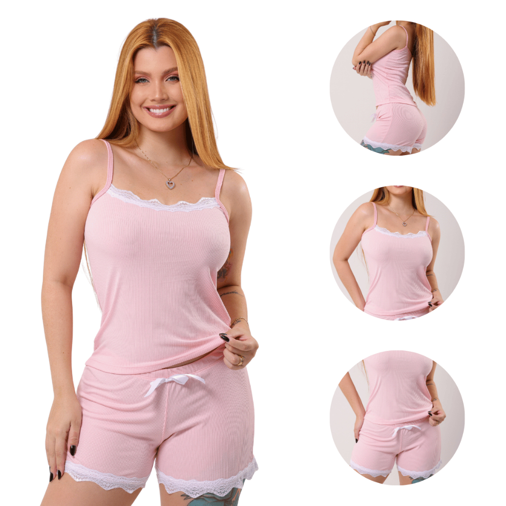 Kit 3 Pijamas Baby Doll Feminino Canelado Renda Luxo Conforto Sexy