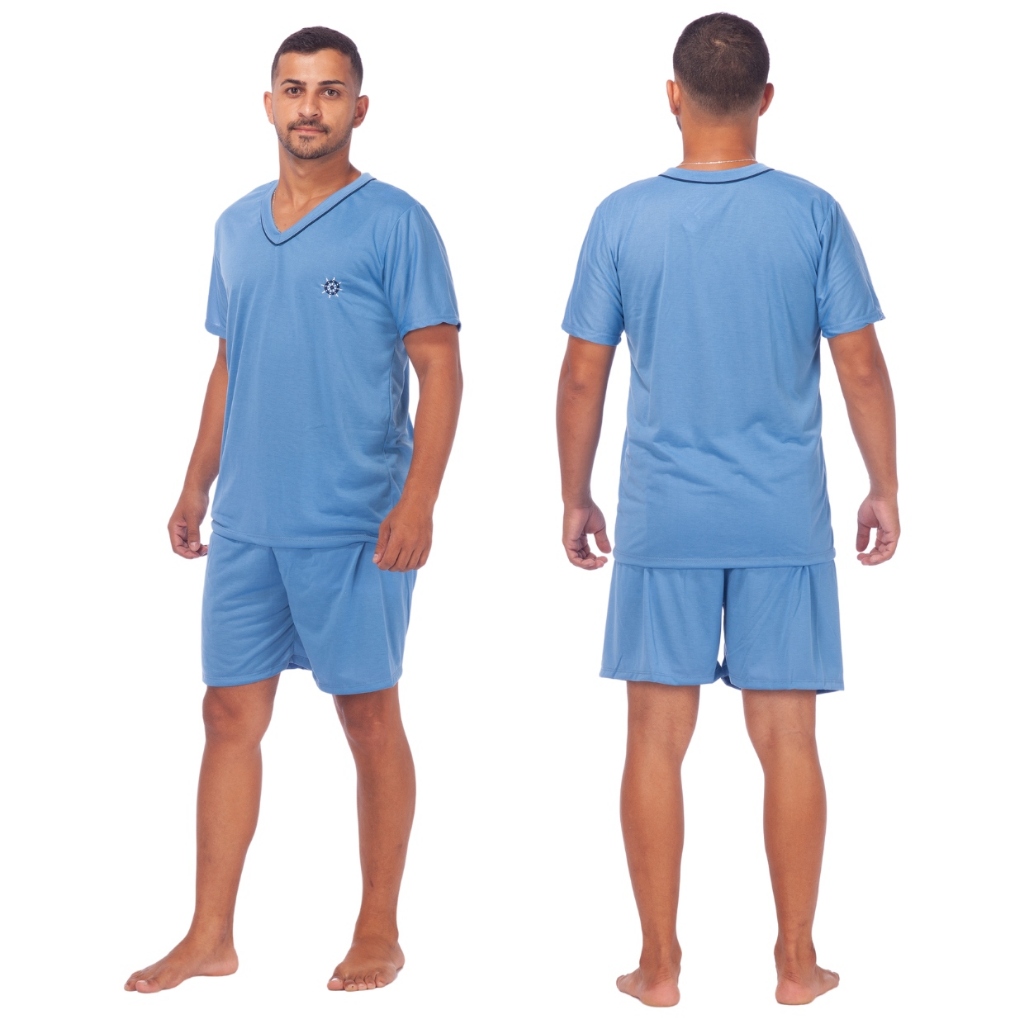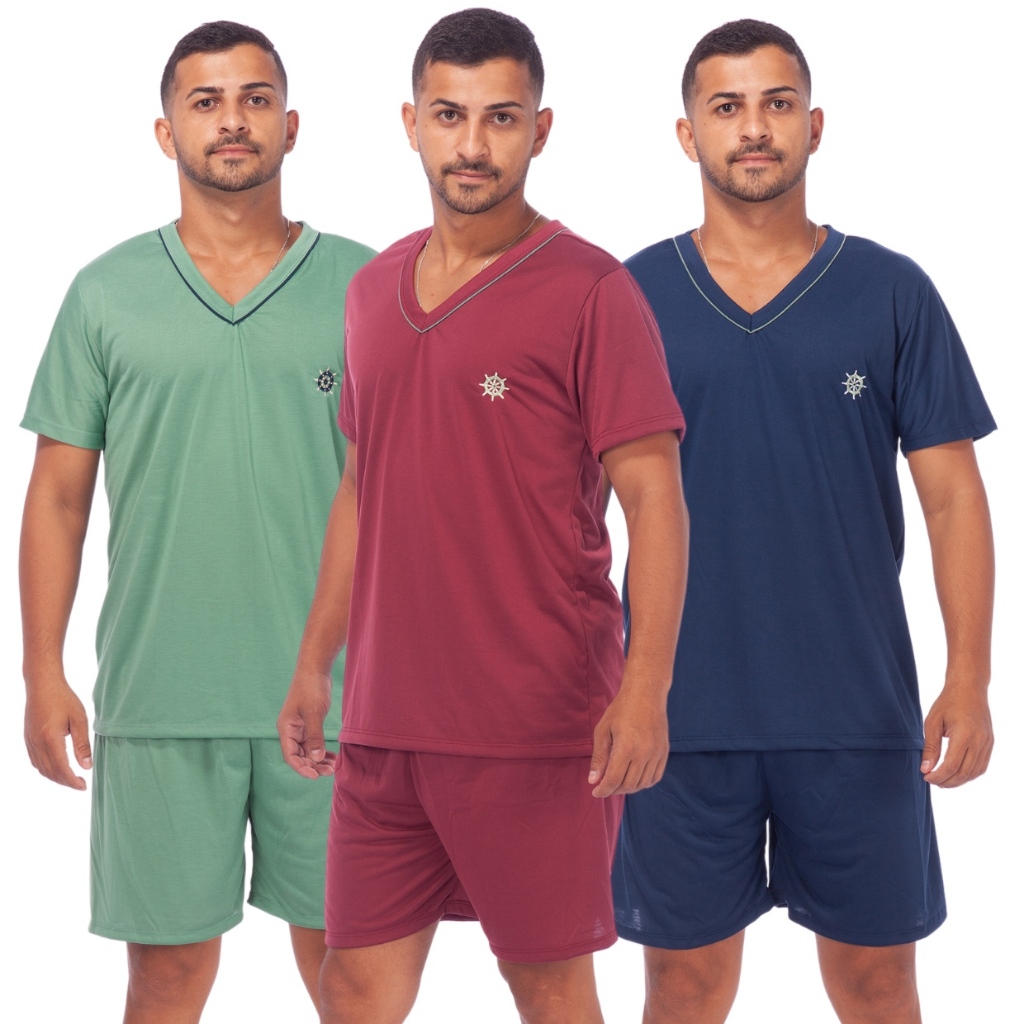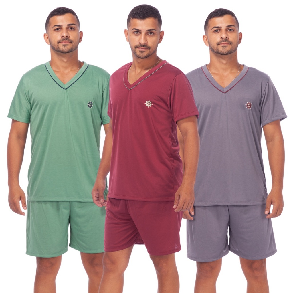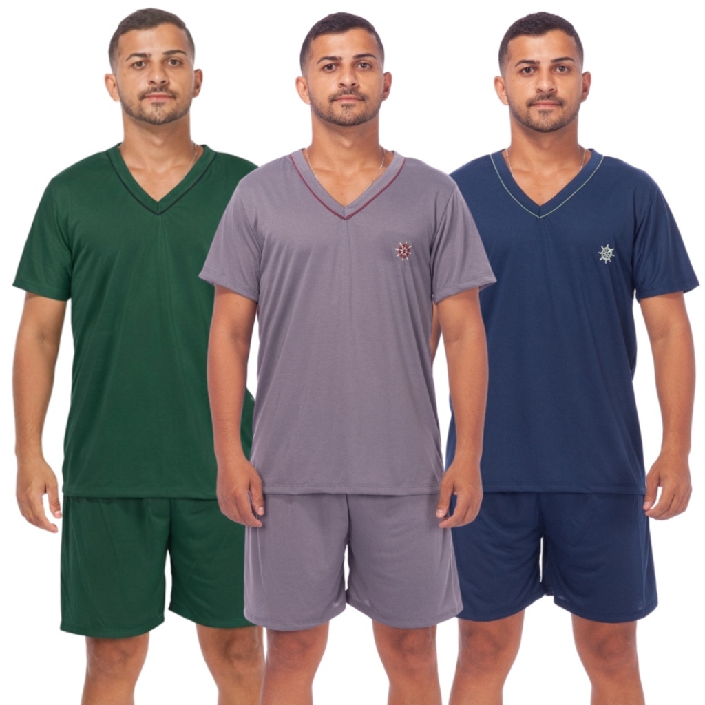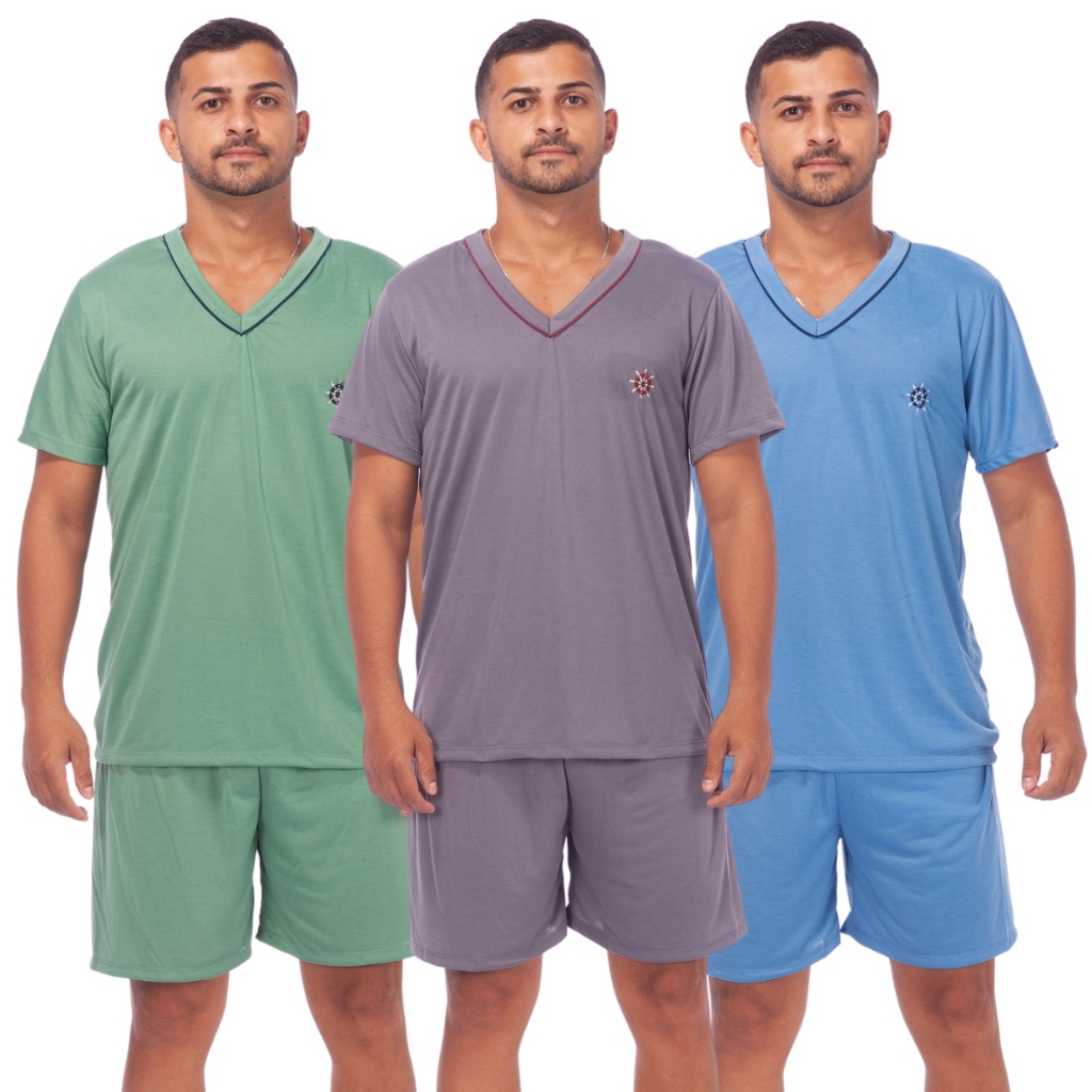 Kit 3 Pijamas Masculino Liso Short Curto Manga Curta Confortável Promoção