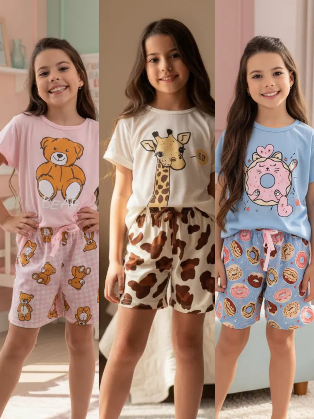 Kit 3 Pijmas Infantil Menina Verão Personagem Manga Curta promoção