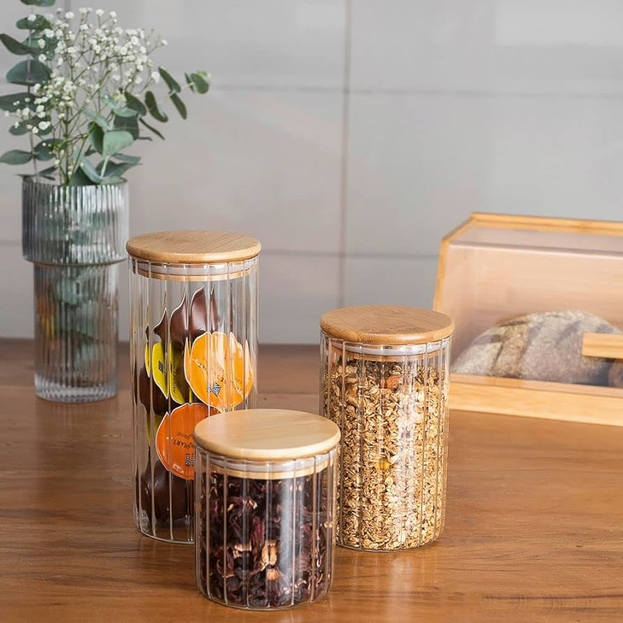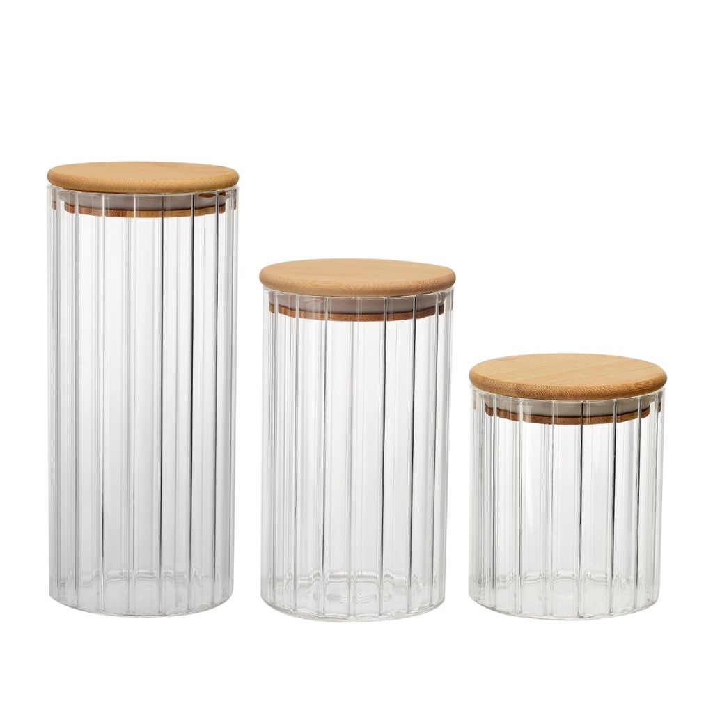 Kit 3 Potes De Vidro Canelado Hermético Mantimentos Com Tampa Bambu 1000ml 750ml e 500ML