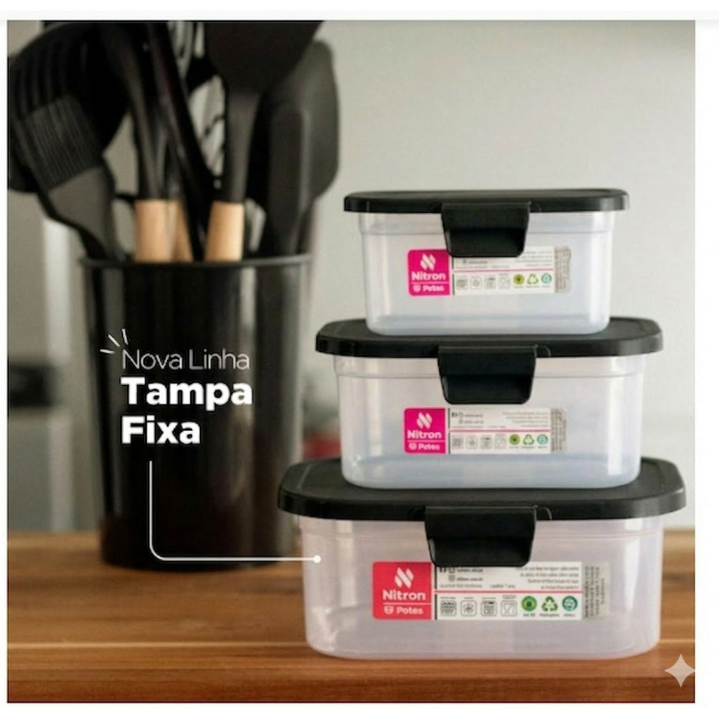 Kit 3 Potes com Tampa Fixa Preto - Nitron