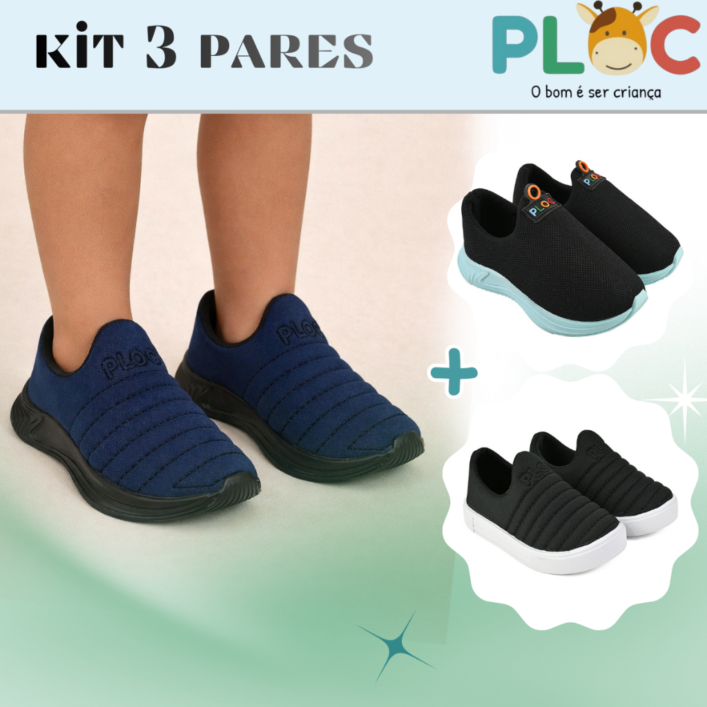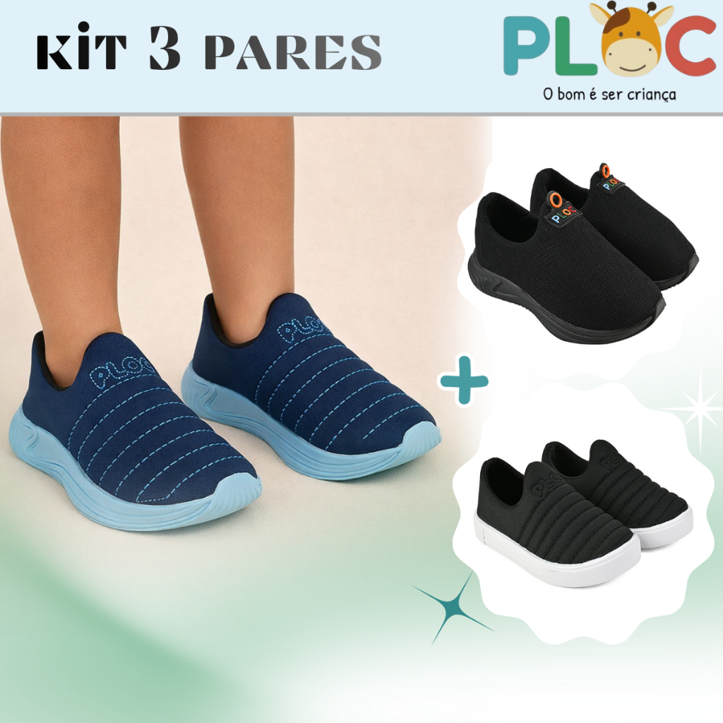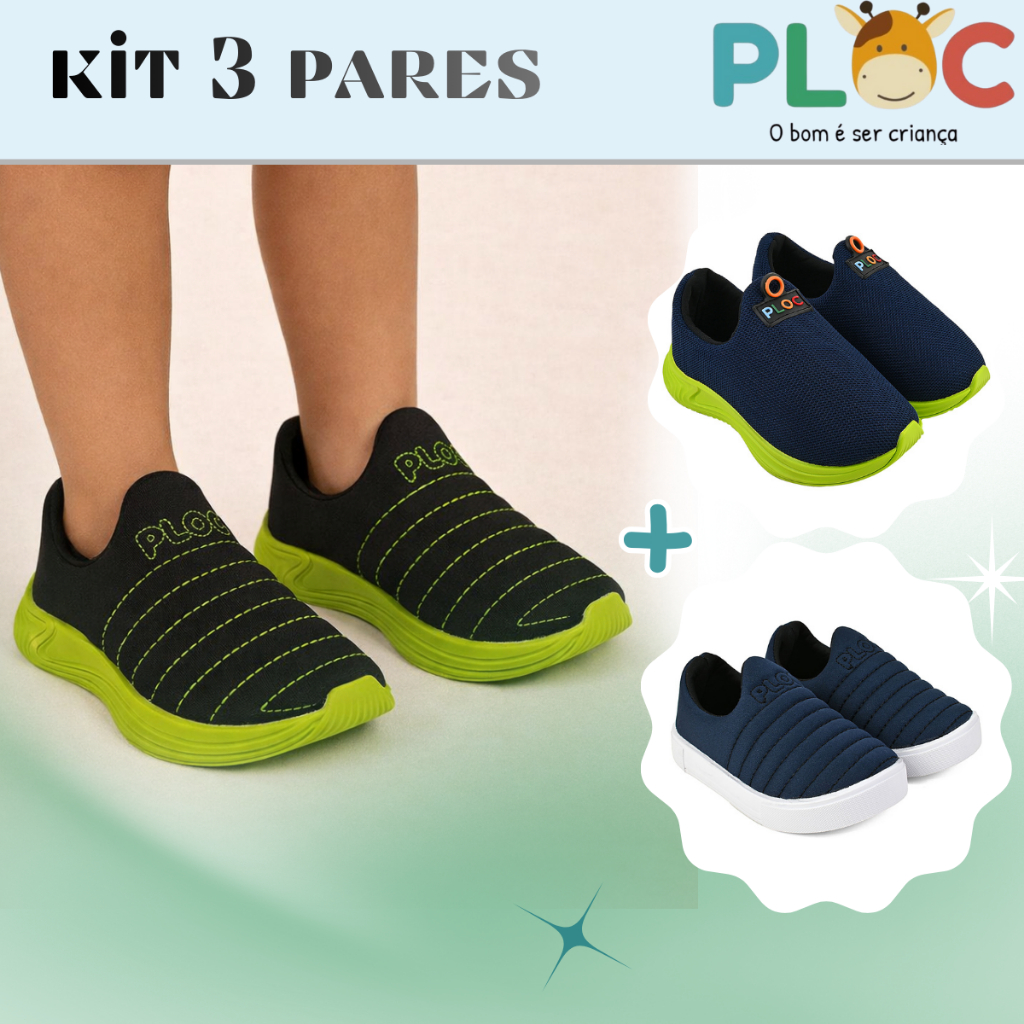 Kit 3 pares Tênis Infantil Ploc - Colors Iate e Play Anatômico Menino