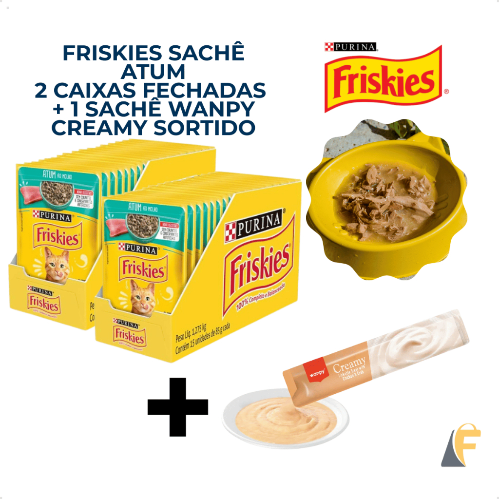 Kit 30 Friskies Gatos Ração Umida Sachê Sabor Atum + Sachê Wanpy Creamy Sabor Sortido