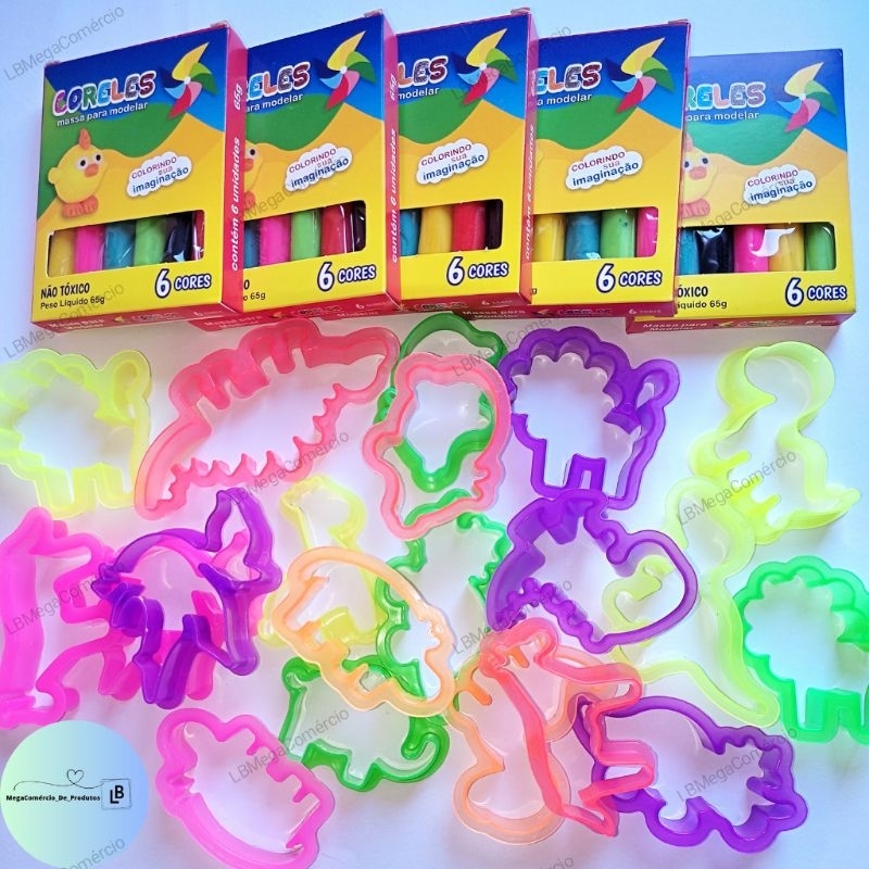 Kit 30 Unidades de Massinha + 20 moldes Forminhas Sortidas para modelar Infantil (5 caixas 65gr)
