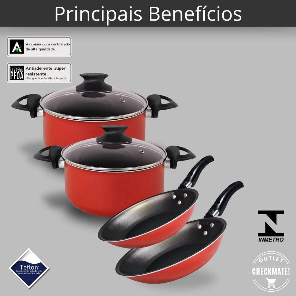 Kit 4 Peças Panelas Caçarolas 22 e 24 cm e Frigideiras Francesas 18 e 20 cm Antiaderente Teflon Cor Vermelho