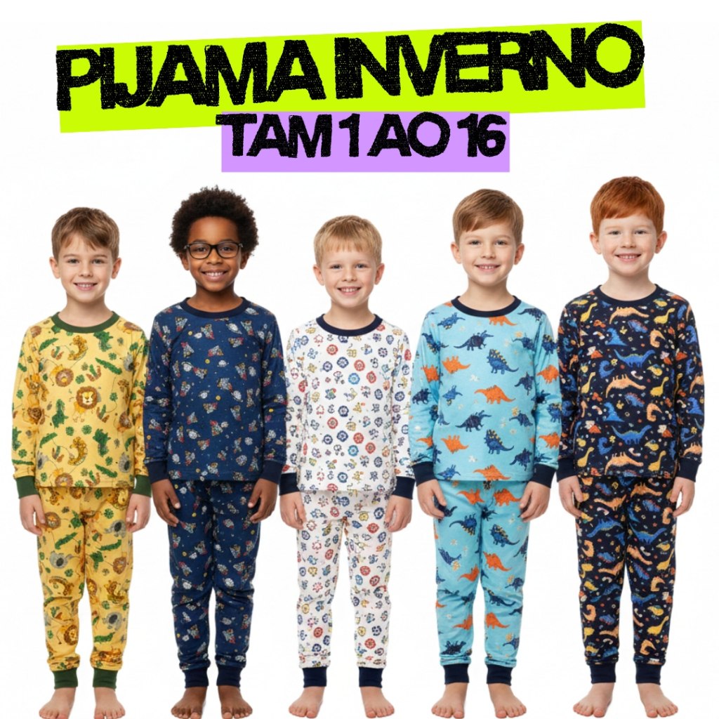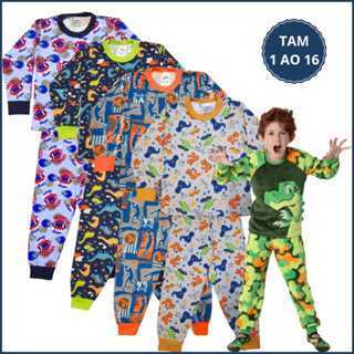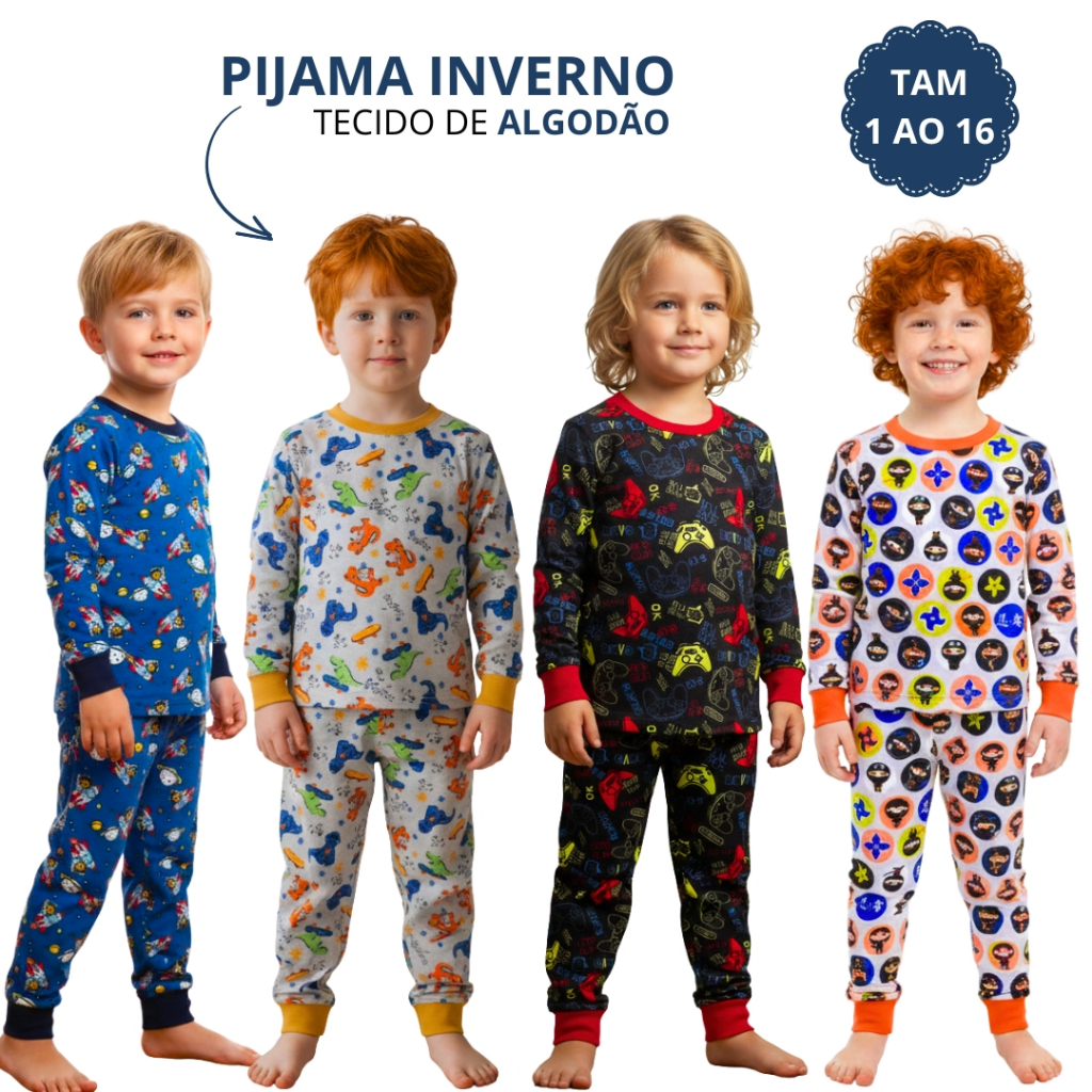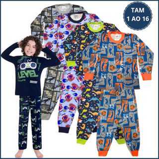 Kit 4 Peças Pijama Infantil Menino Masculino Inverno 2 Camiseta Manga Longa 2 Calça Punho 1 ao 16