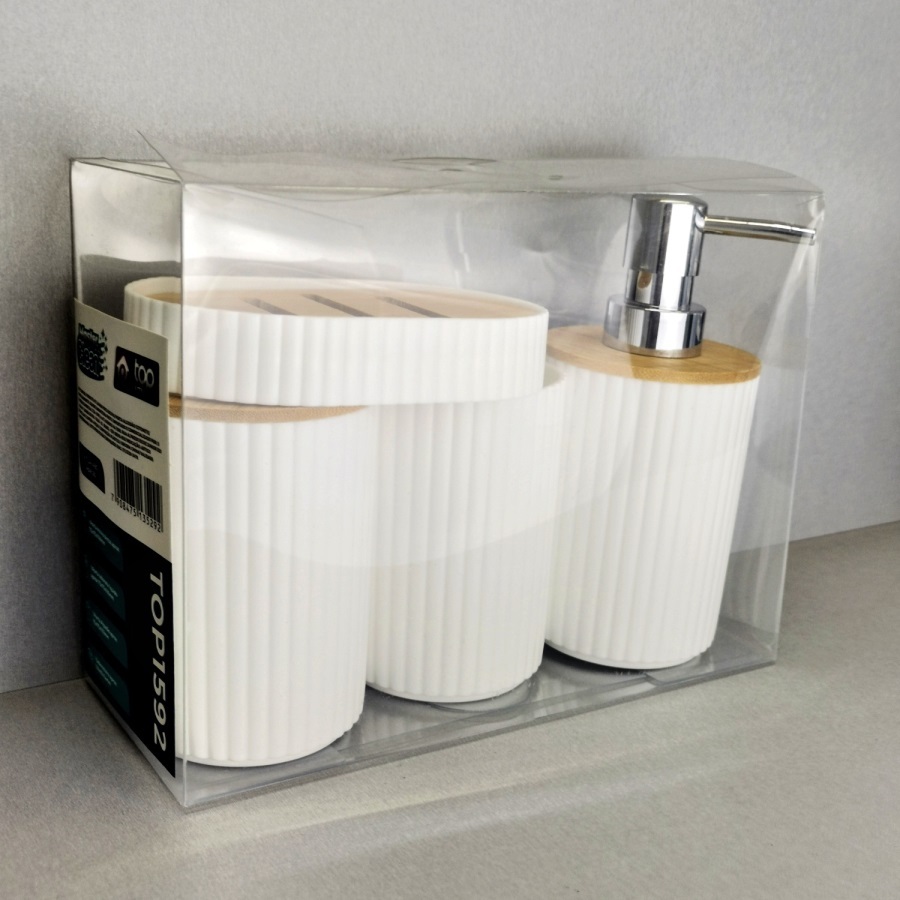 Kit 4 Peças Pra Banheiro Bambu Conjuto Saboneteira Porta Sabonete Líquido Copo E Porta Escova De Dentes Acessorios