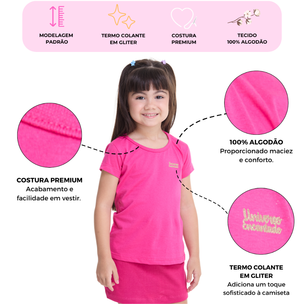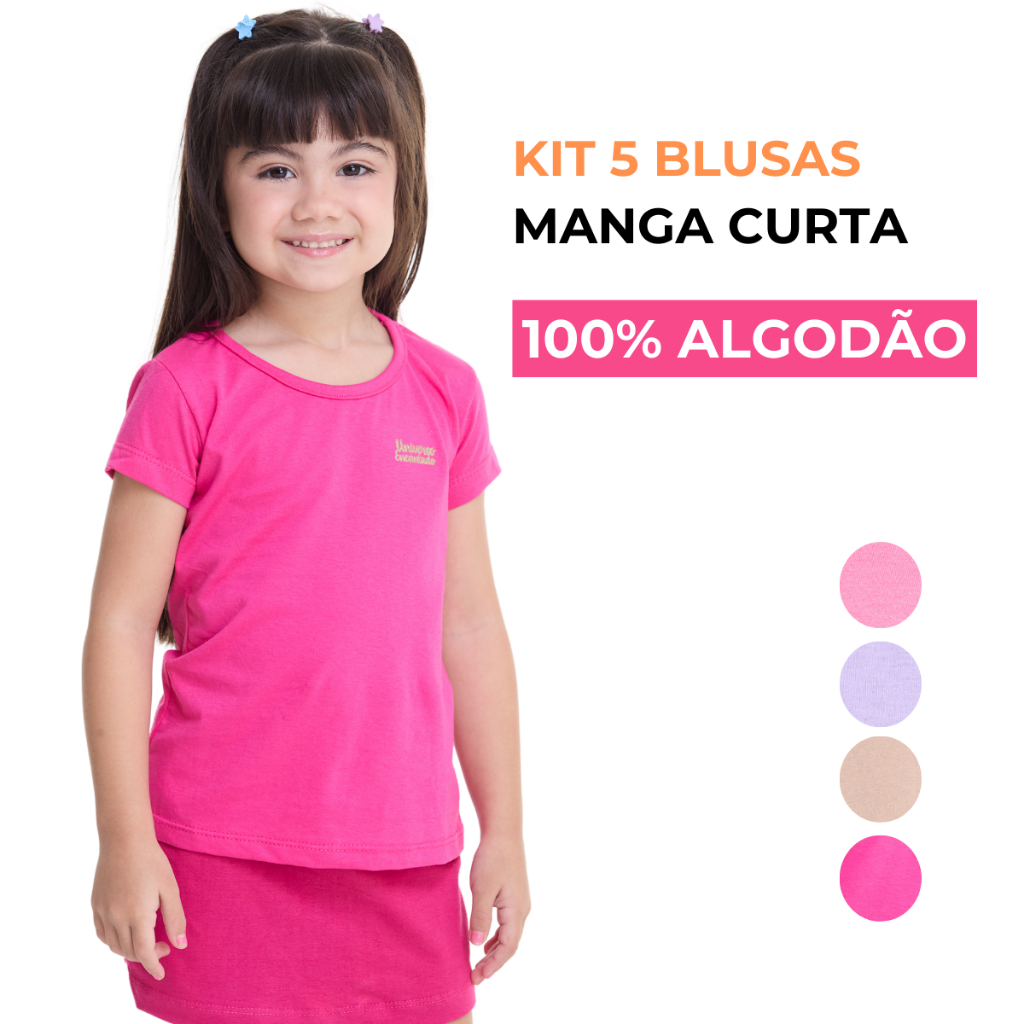Kit 5 Blusa Manga Curta Infantil Menina 100% Algodão Lisa Basica