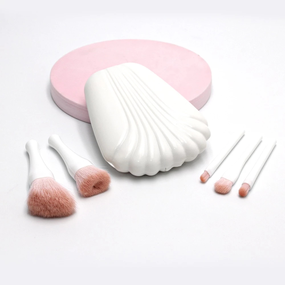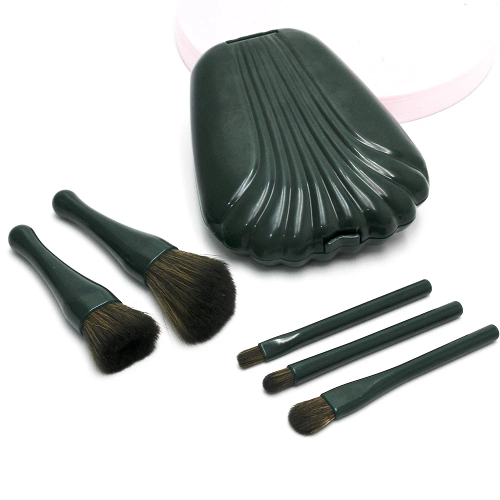 Kit 5 Pincéis de Maquiagem Com Estojo em Forma de Concha do Mar e Espelho Portátil - WL