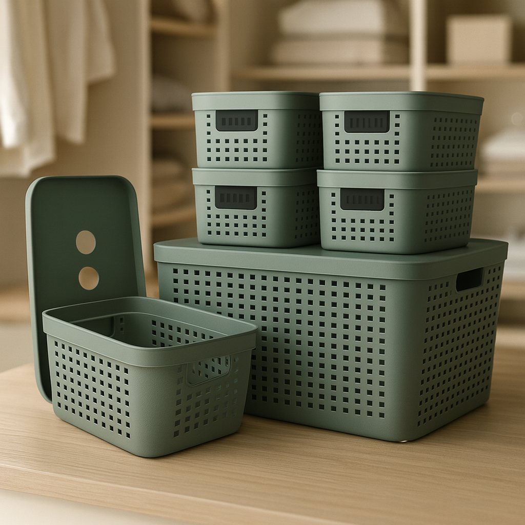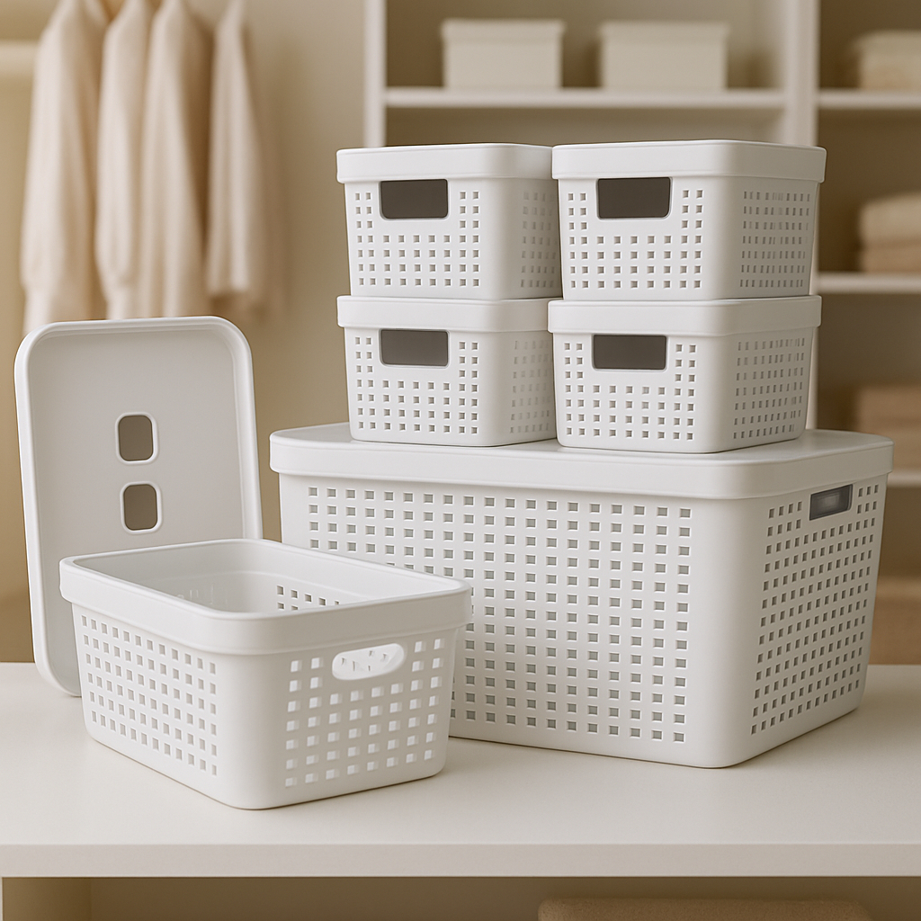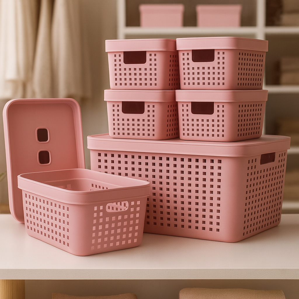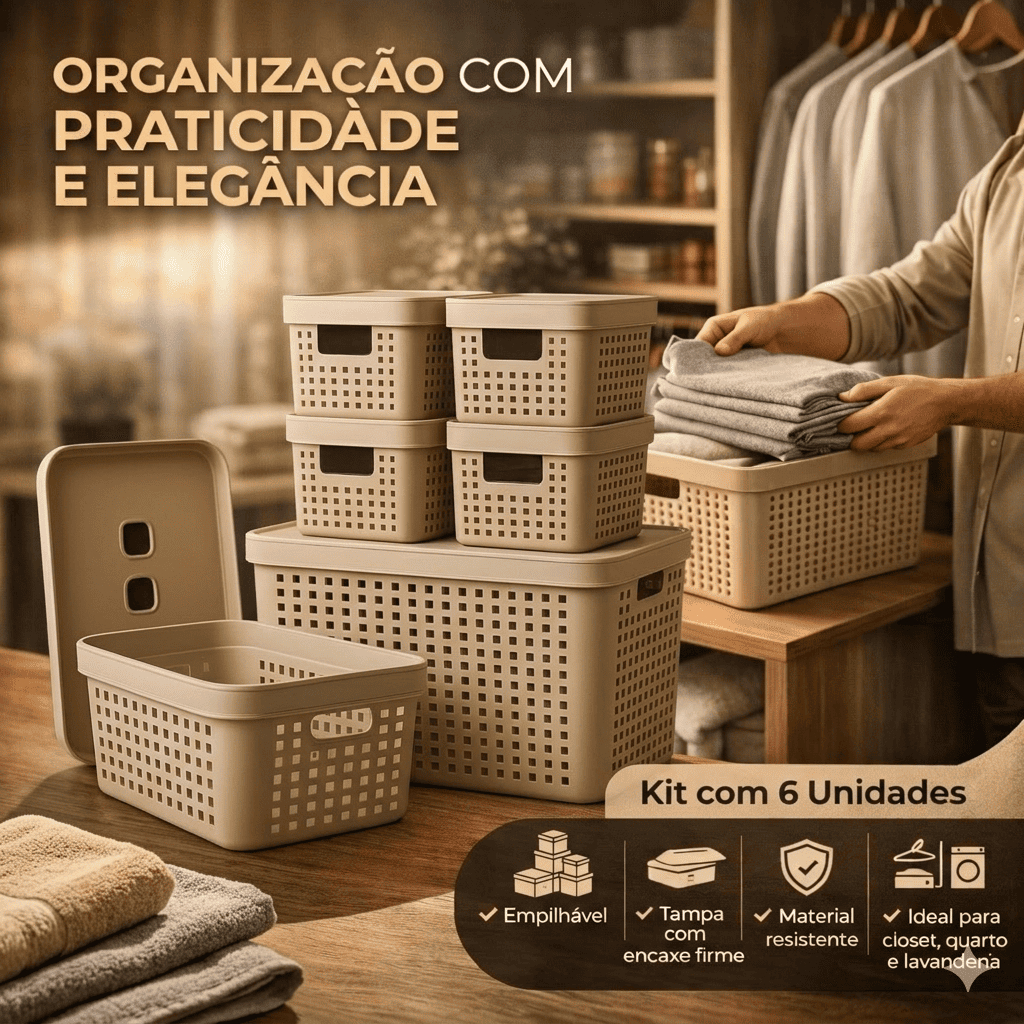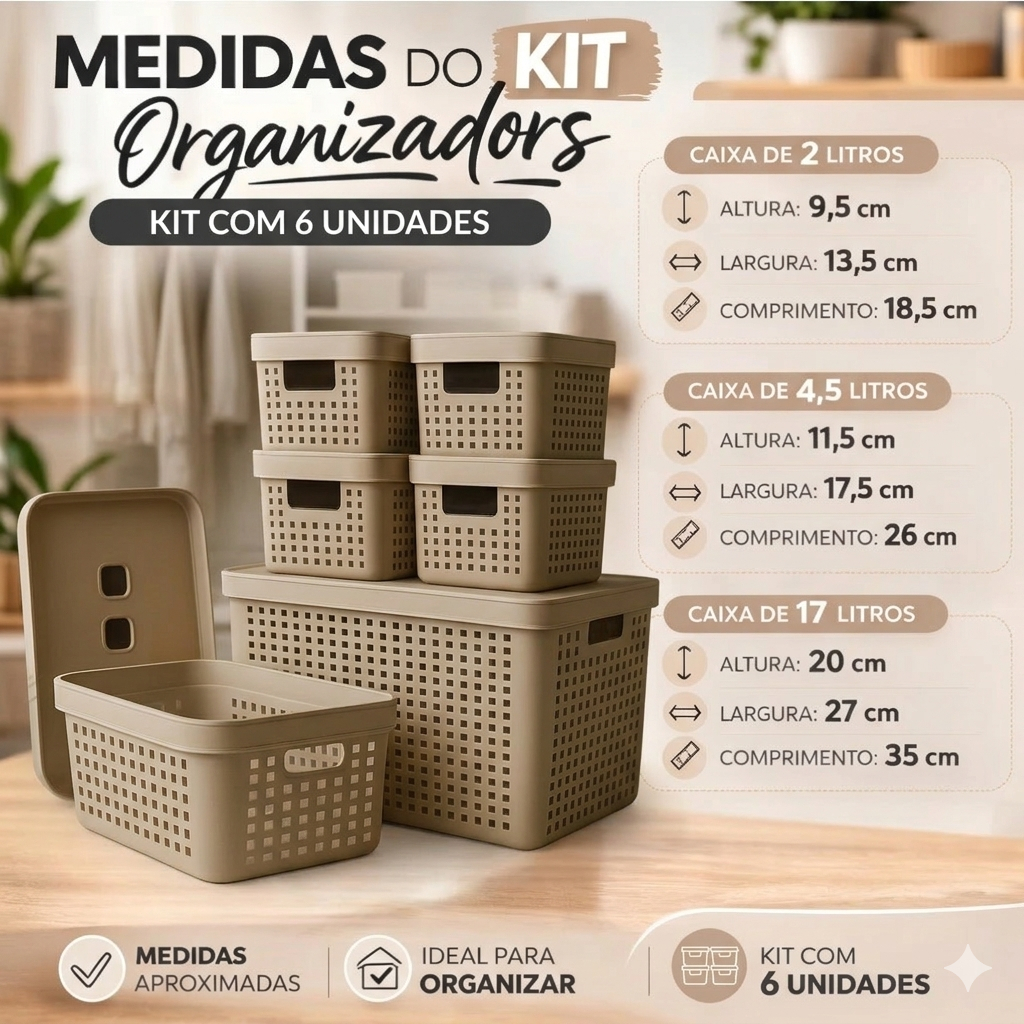 Kit 6 Caixa Organizadora com Tampa 17 L 4,5 L 2 L Cesto Grande em Plástico para Organização