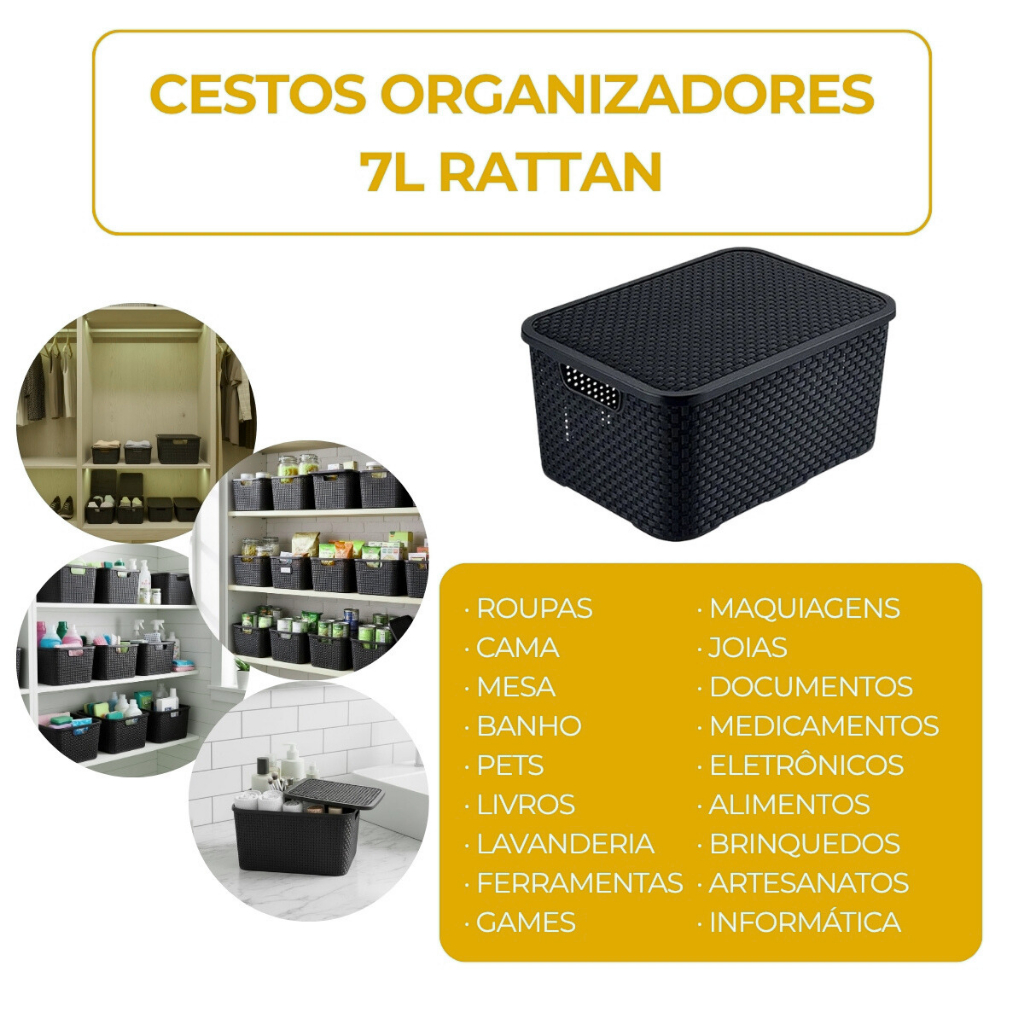 Kit 6 Caixas Organizadoras Rattan Multiuso 7L Cor Preta