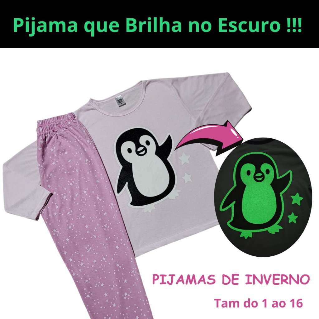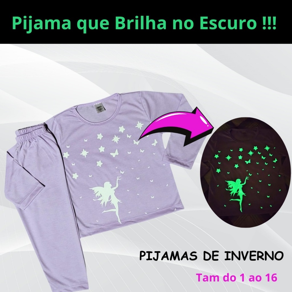 Kit 6 peças (3 conjuntos) Pijama Inverno Infantil Juvenil Menina Brilha no Escuro 1 ao 16