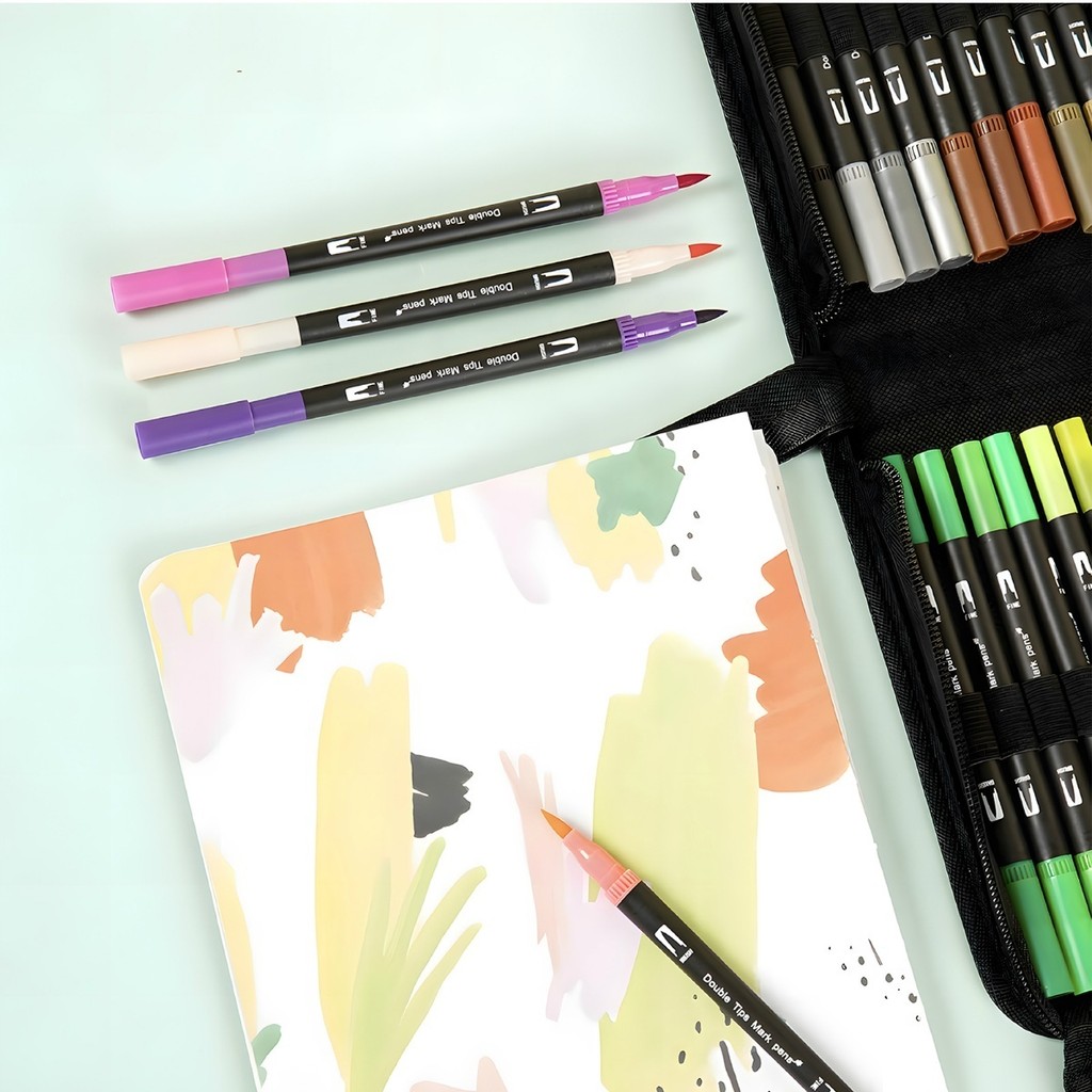 Kit 60 Cores Caneta Dual Brush Coloridas para Desenho e Lettering e Estojo de Armazenamento com Zíper marisa