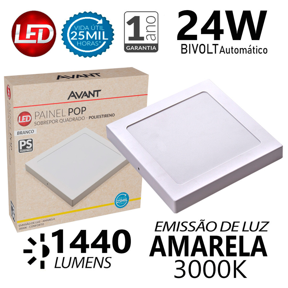 Kit 7 Painel de LED Avant Quadrado 26cm Luz Amarela 24W Bivolt Instalação Sobrepor Iluminação Geral