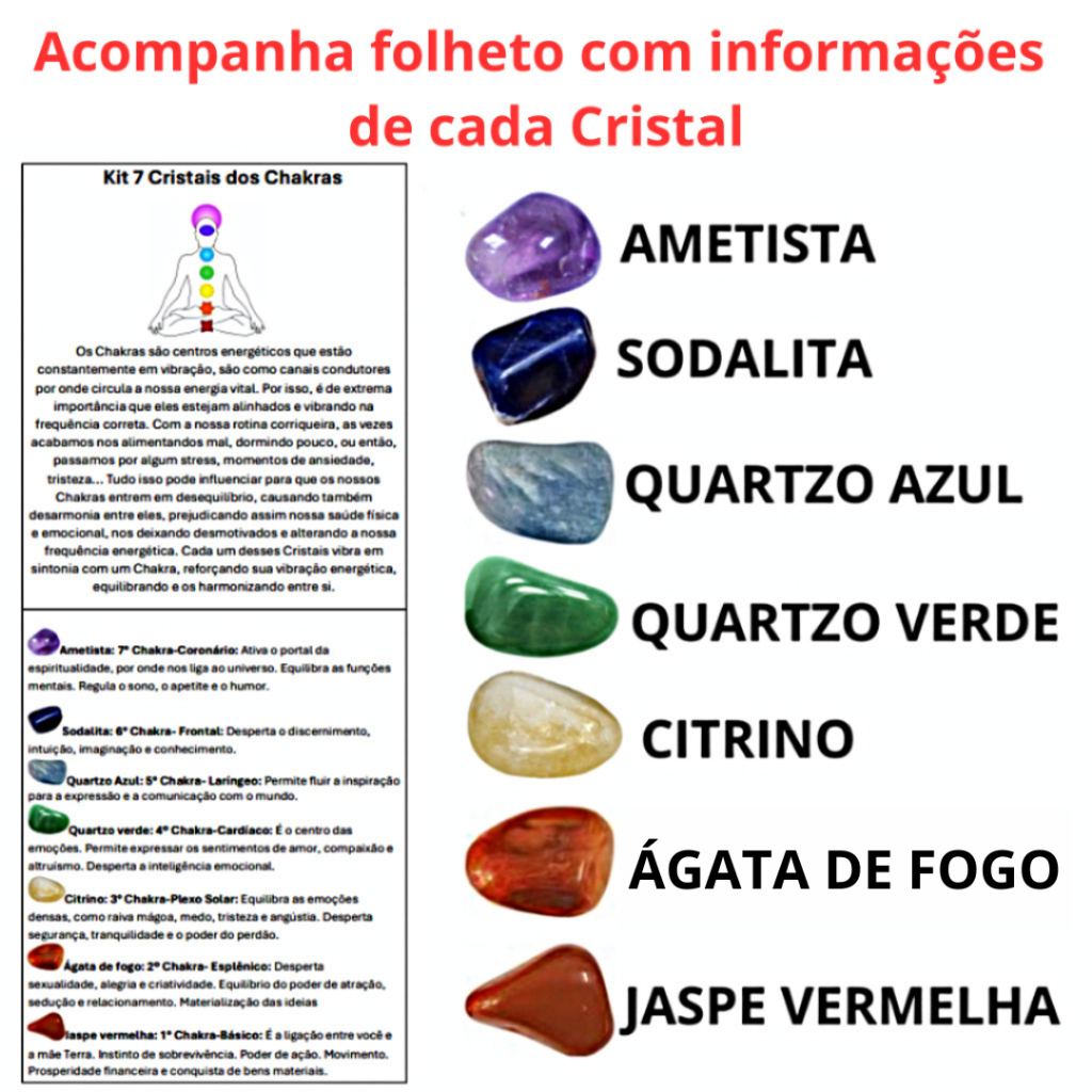Kit 7 Pedras dos Chakras + Selenita Branca - Cristais 100% Natural - Alinhe e Equilibre seus Chakras