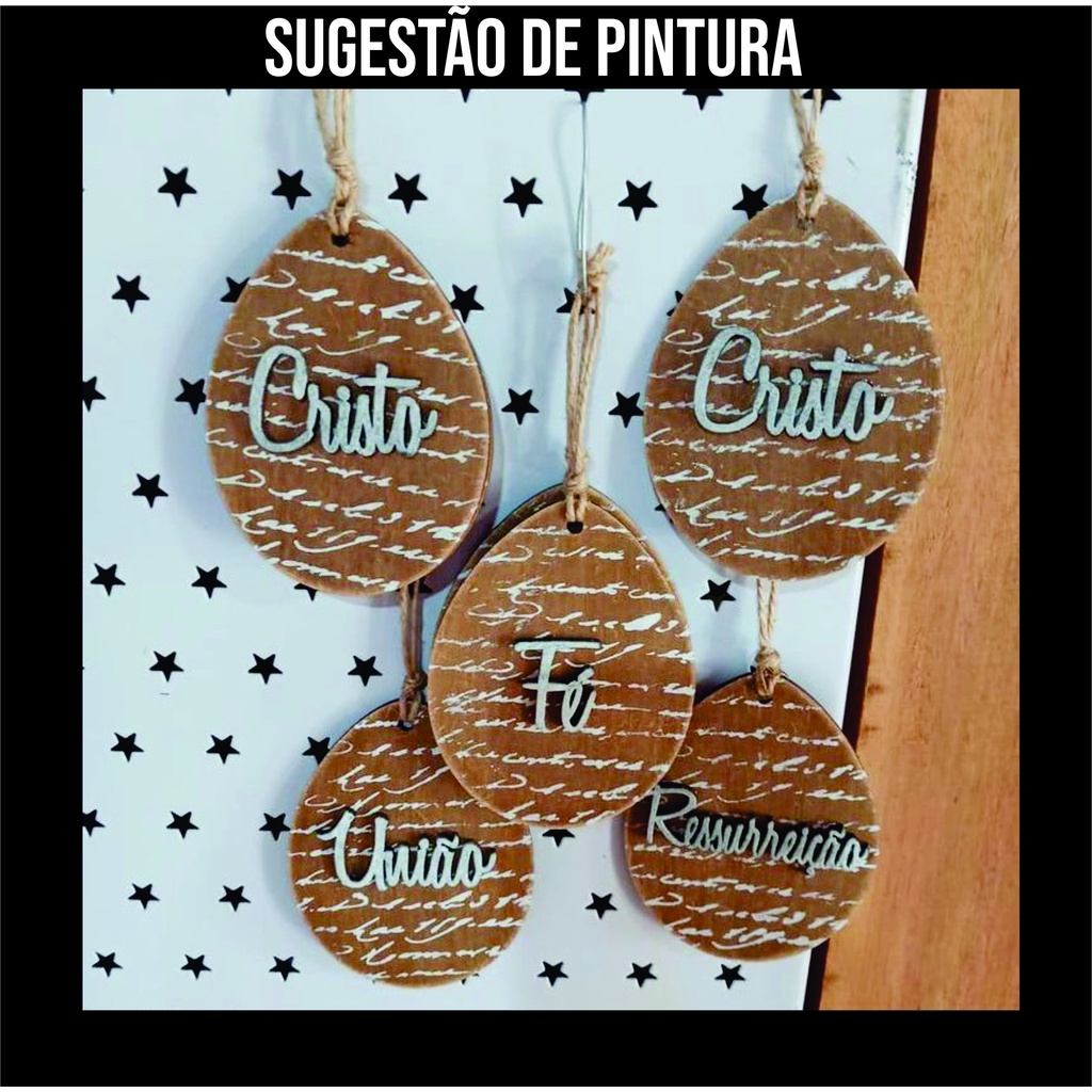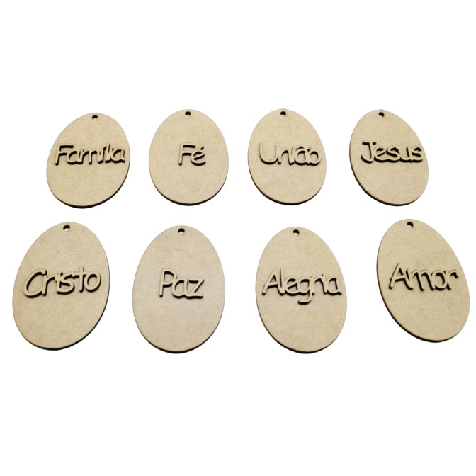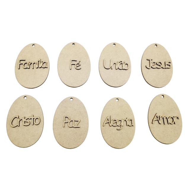 Kit 8 unidades ovo + palavras de Páscoa em MDF cru de 3mm com furo
