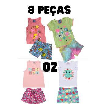 Kits 8 Peças Verão Infantil Menina 4 Conjuntos Leves e Divertidos Tamanhos 1 ao 12