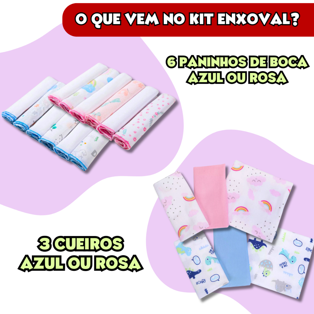 Kit 9 Peças Enxoval Bebe 3 Cueiros 6 Paninhos De Boca Babete 100% Algodão Estampado