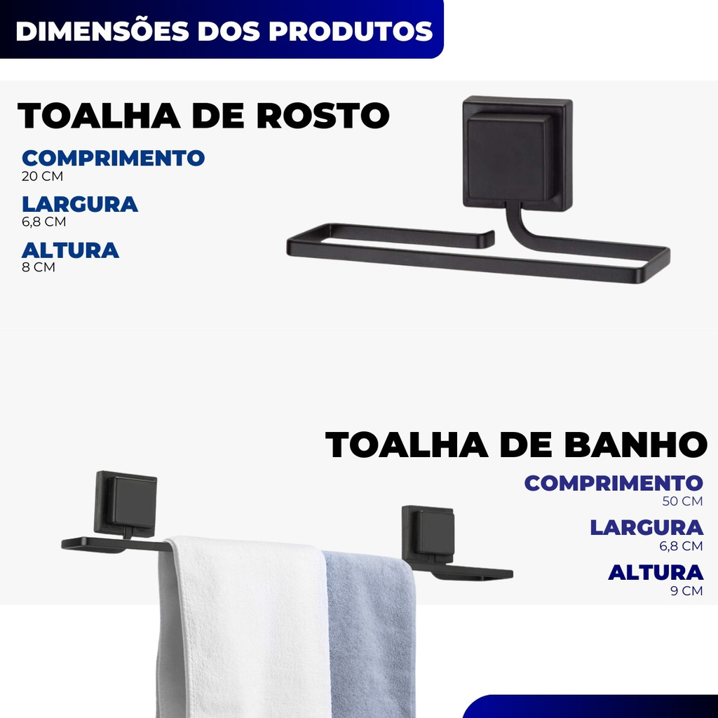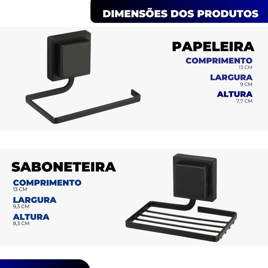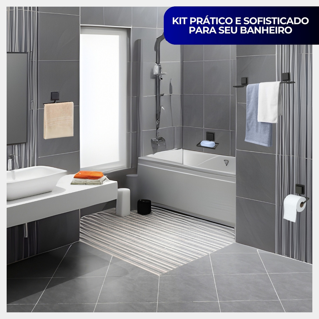 Kit Acessórios Banheiro Porta Toalha Rosto Banho Saboneteira Papeleira Dupla Face 3M Preto Arthi