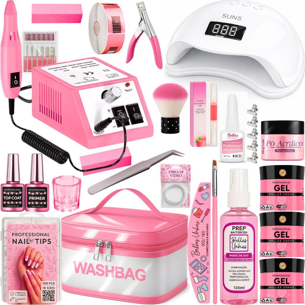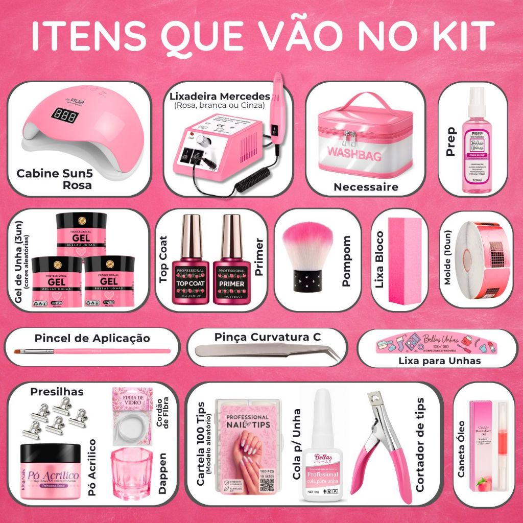 Kit Alongamento Unha Gel Profissional Lixadeira Mercedes e Cabine Led Uv Necessaire - Envio Imediato