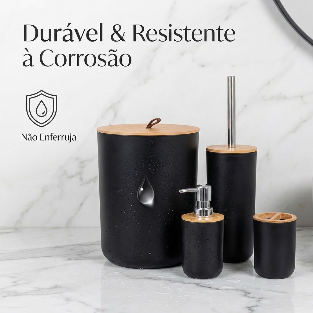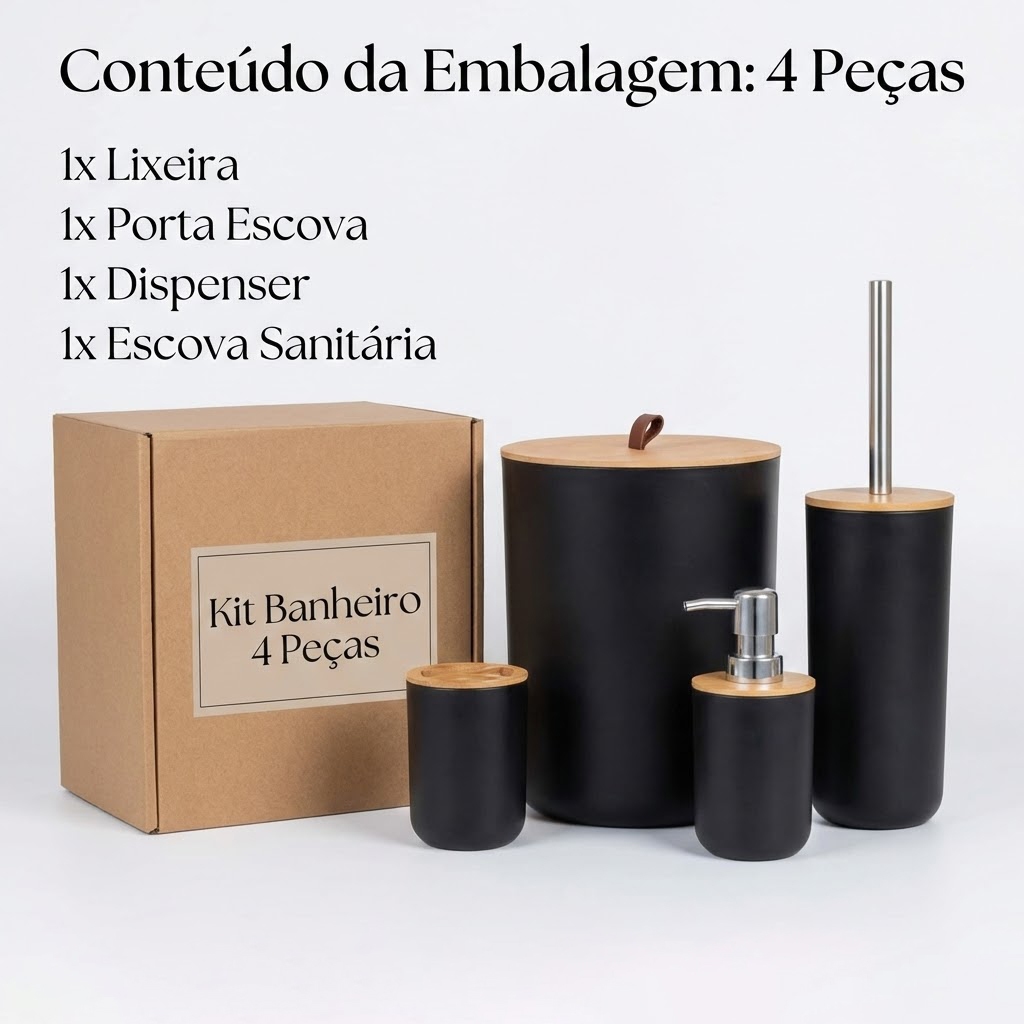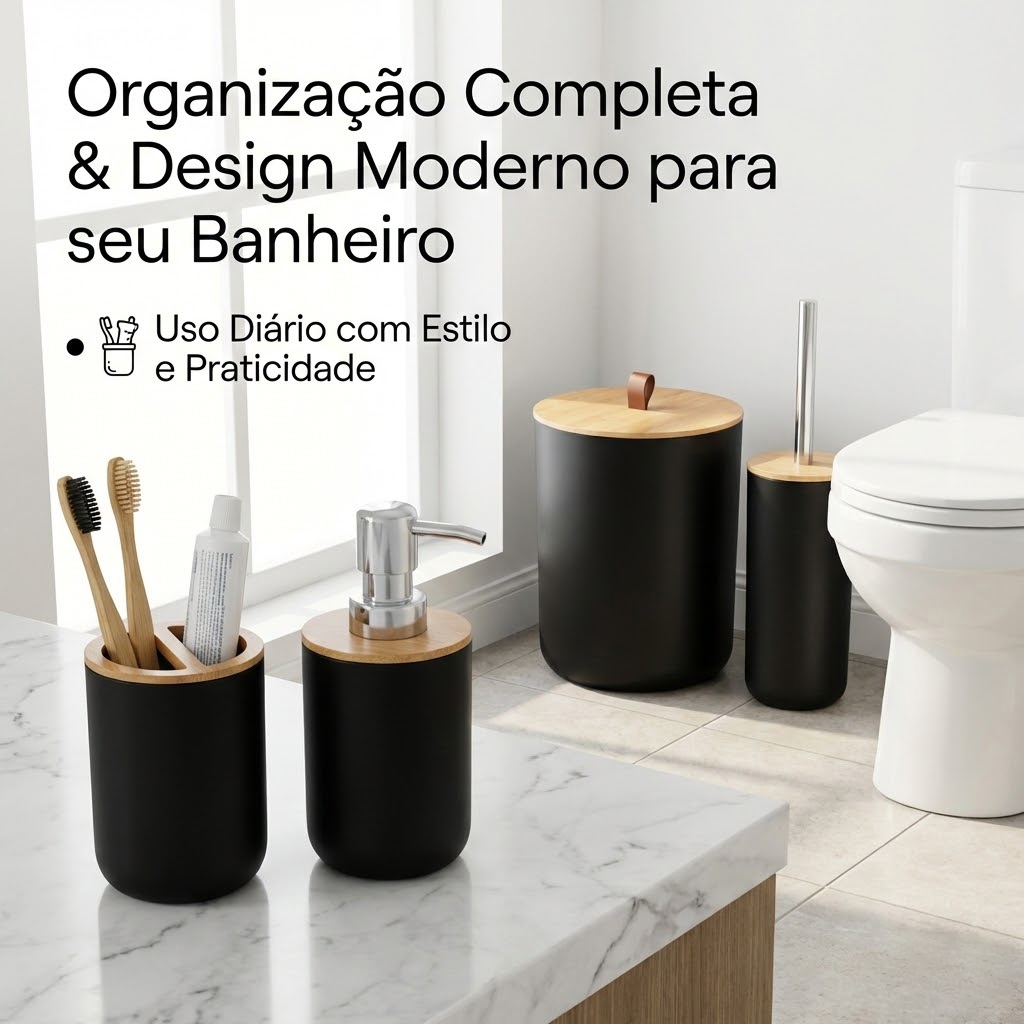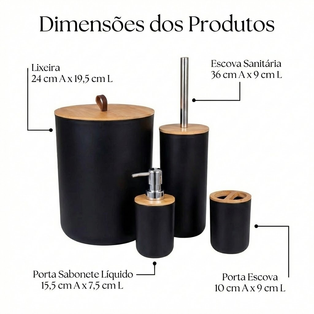 Kit Banheiro Conjunto Acessórios Lavabo Bambu 4 Peças Lixeira Dispenser Porta Escova Sanitária Tippi
