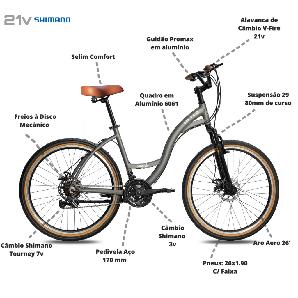 Kit Bicicleta Aro 26 BLITZ Comodo Urbana 21v + Cestinha e Cadeado