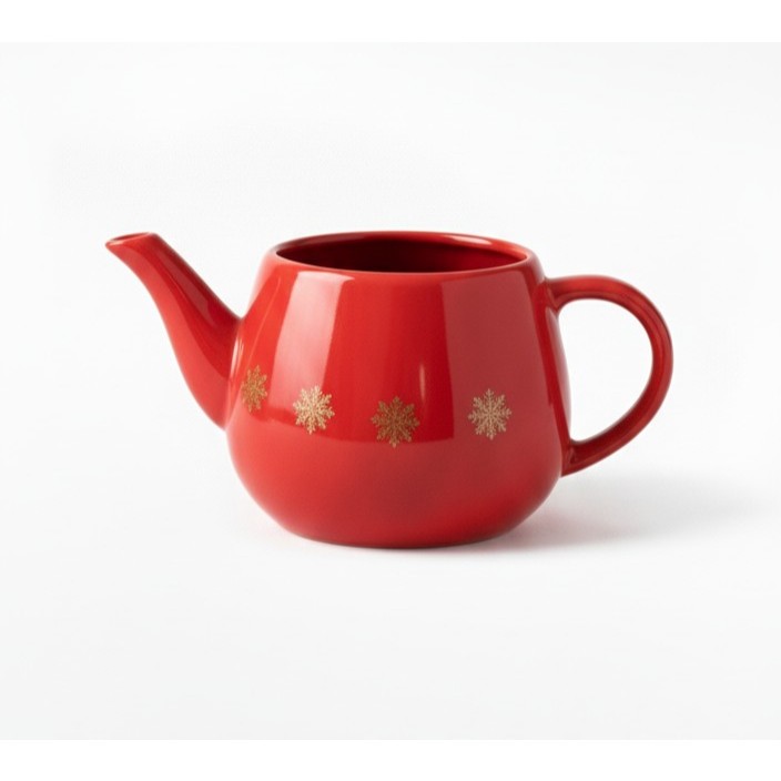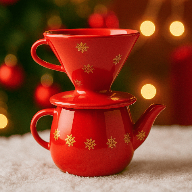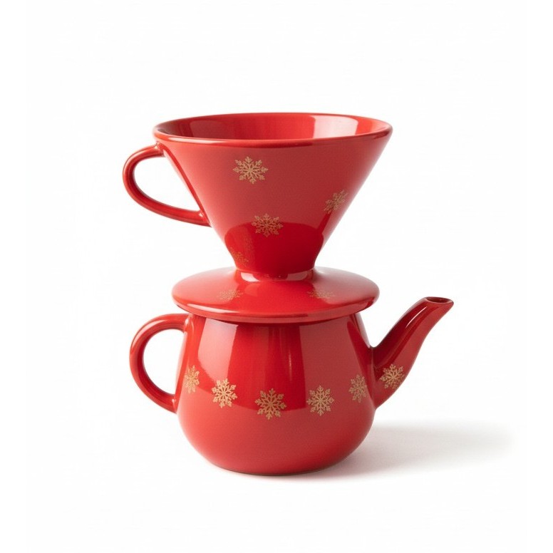 Kit Bule com Coador Filtro de Porcelana Café Chá – Vermelho com Flocos de Neve