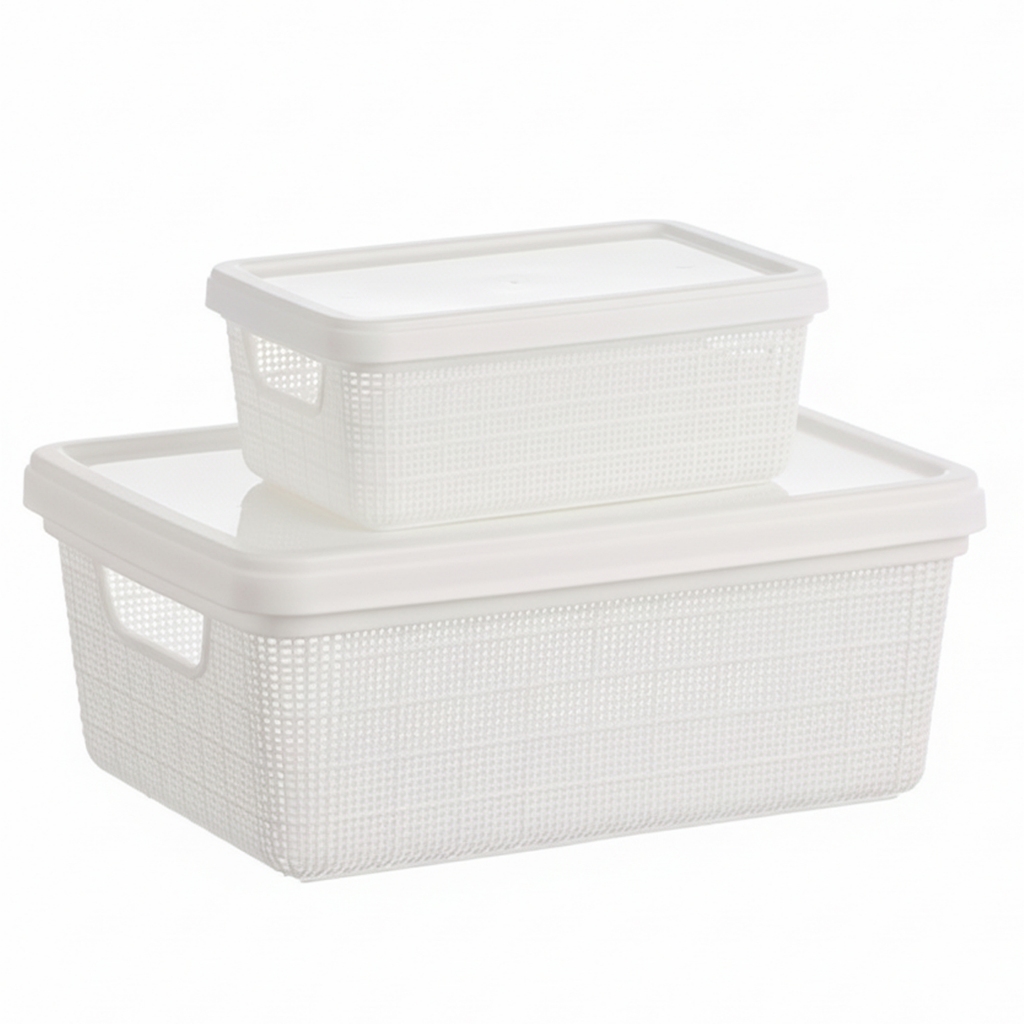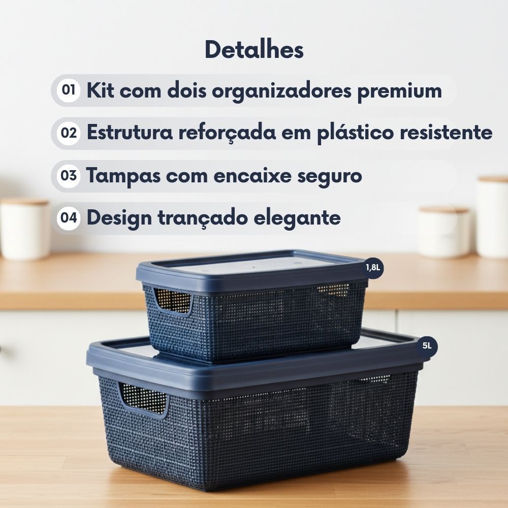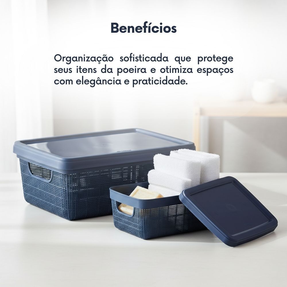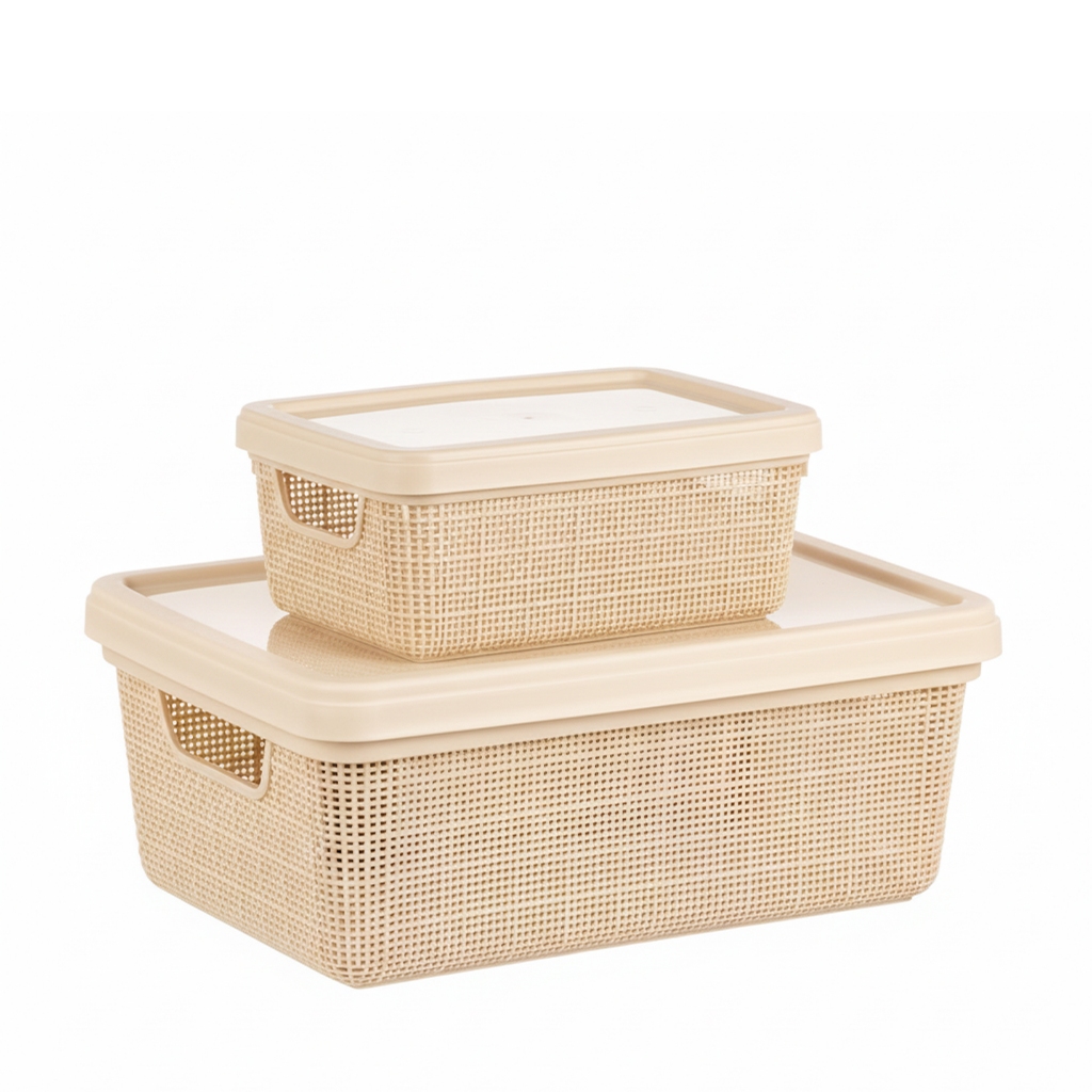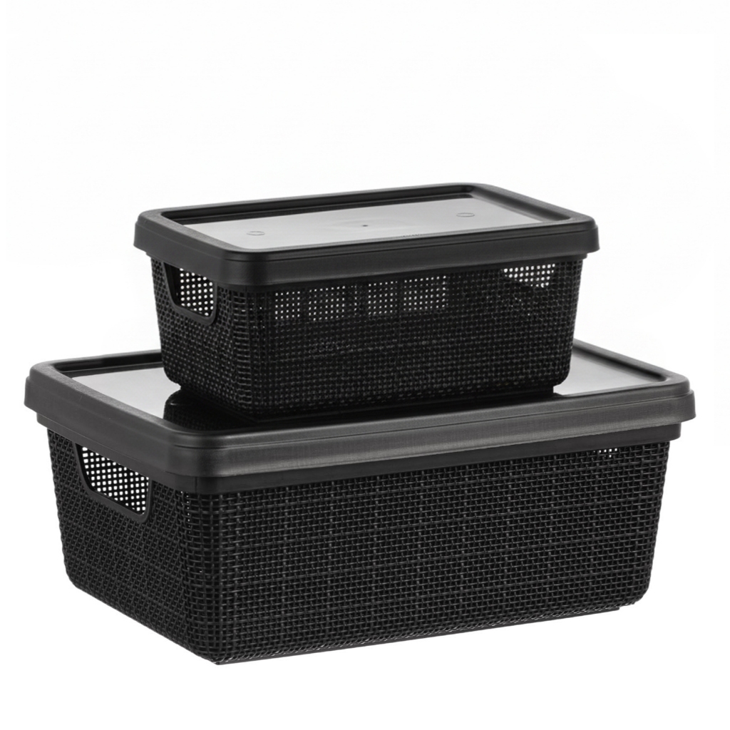 Kit Caixa Organizadora 1,8L + 5L com Tampa Plástico textura Juta cesta multiuso Para Organização