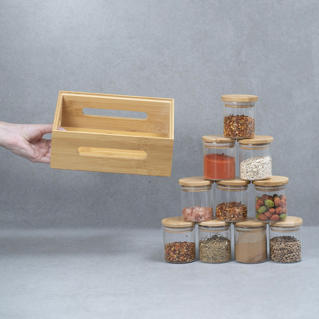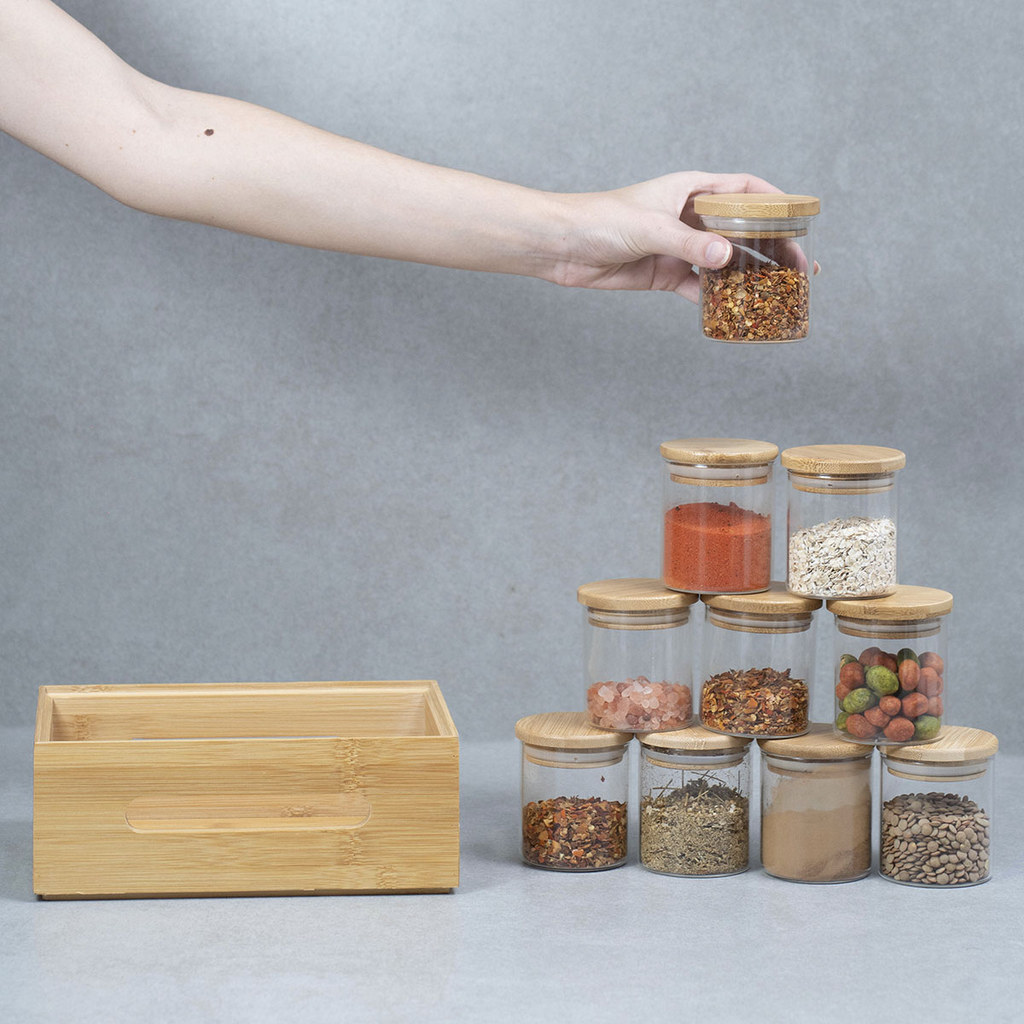 Kit Caixa de Bambu Vazada E 10 Potes de Vidro de 200ml Oikos