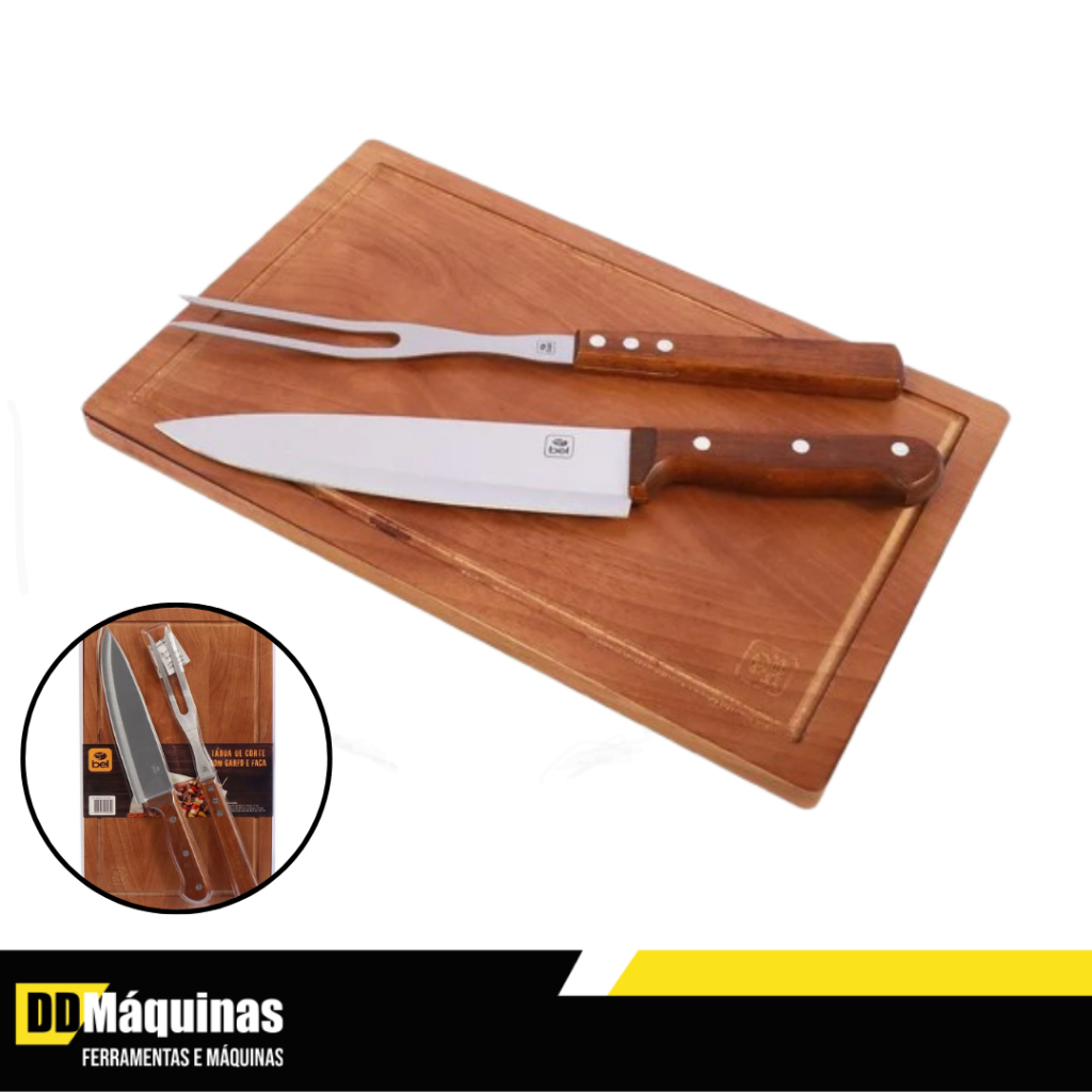 Kit Churrasco Premium 3 Peças: Tábua de Madeira + Faca e Garfo em Aço Inox (Corte e Serviço)- BEL