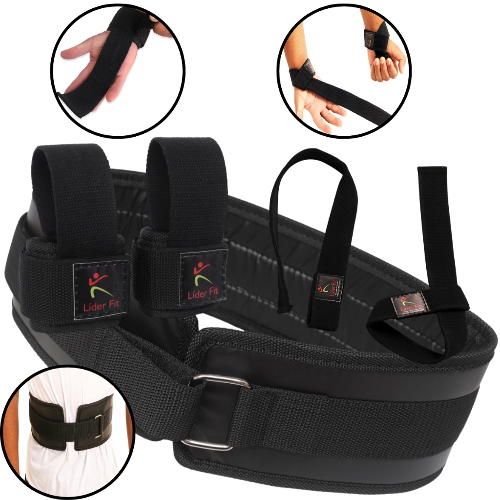 Kit Cinto de Musculação Academia Agachamento Crossfit + Luvas Strap Munhequeira + Strep Musculação