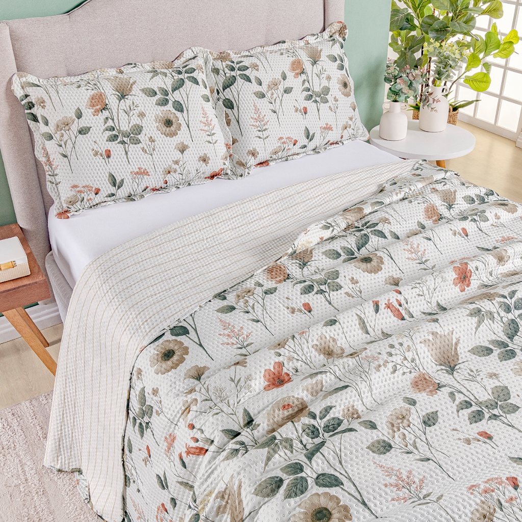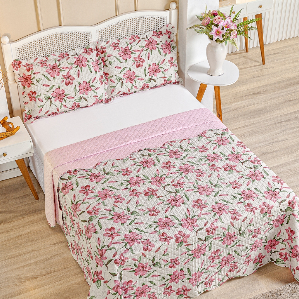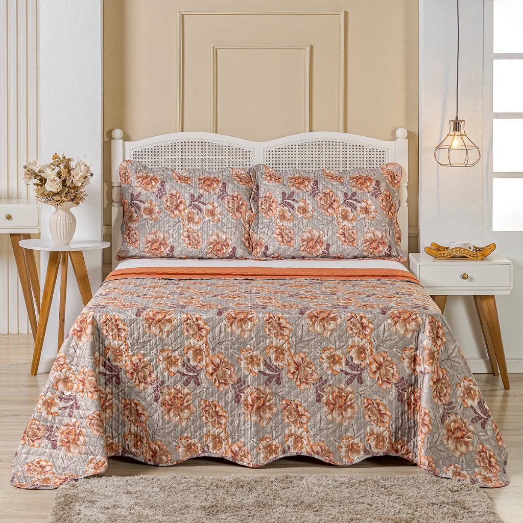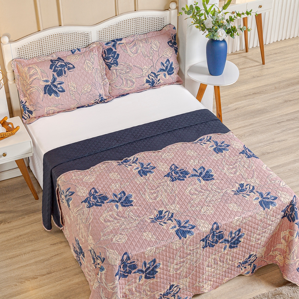 Kit Cobre Leito Colcha Queen Bouti 3 Peças Dupla Face Estampada Porta Travesseiro Aba Americana
