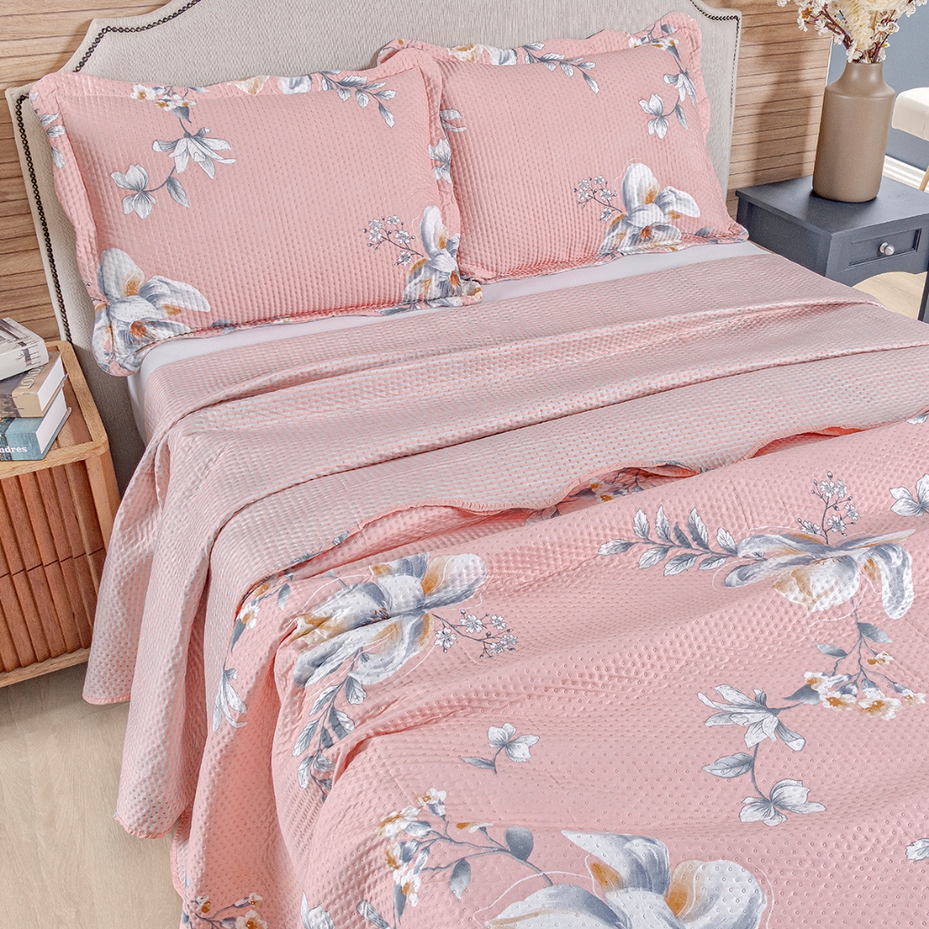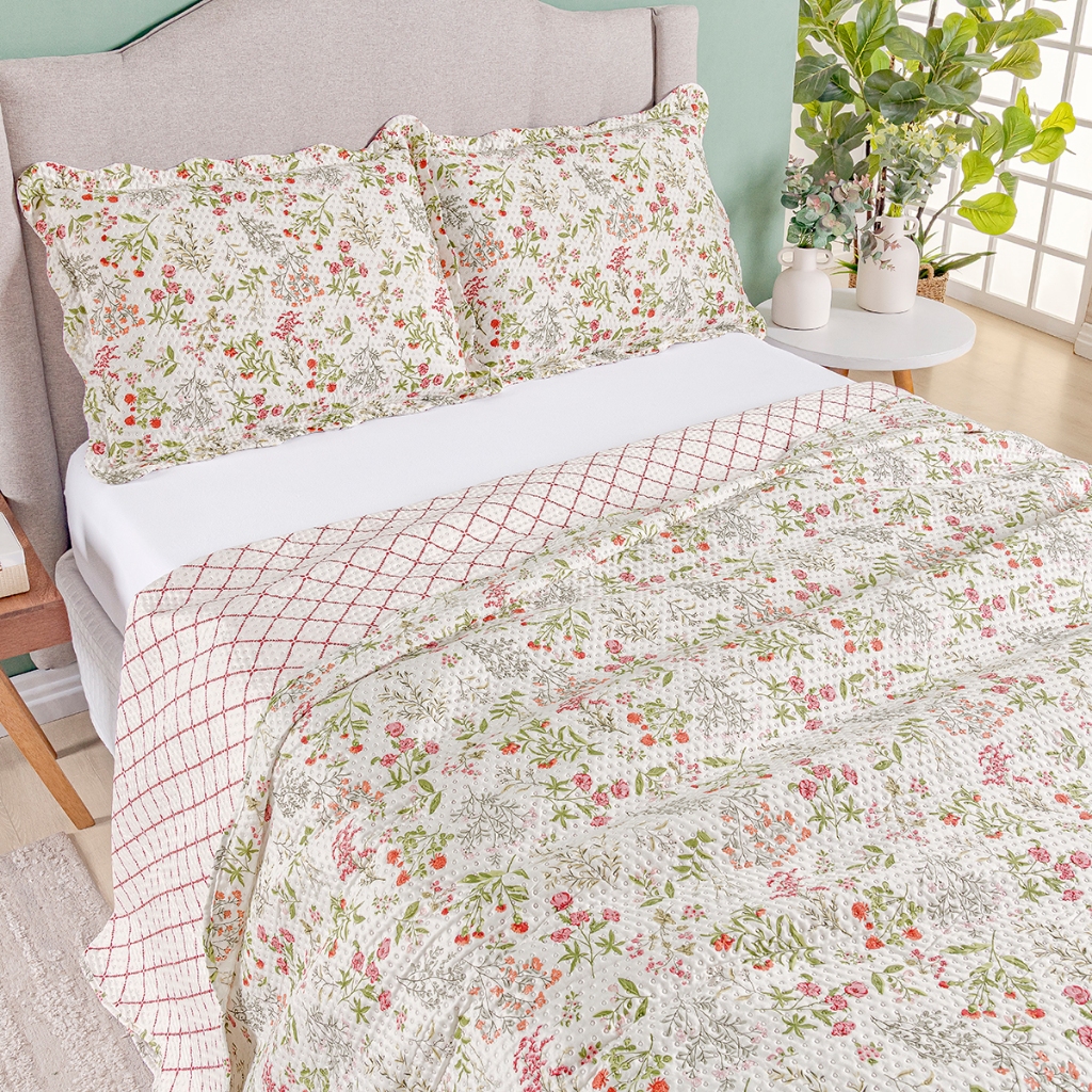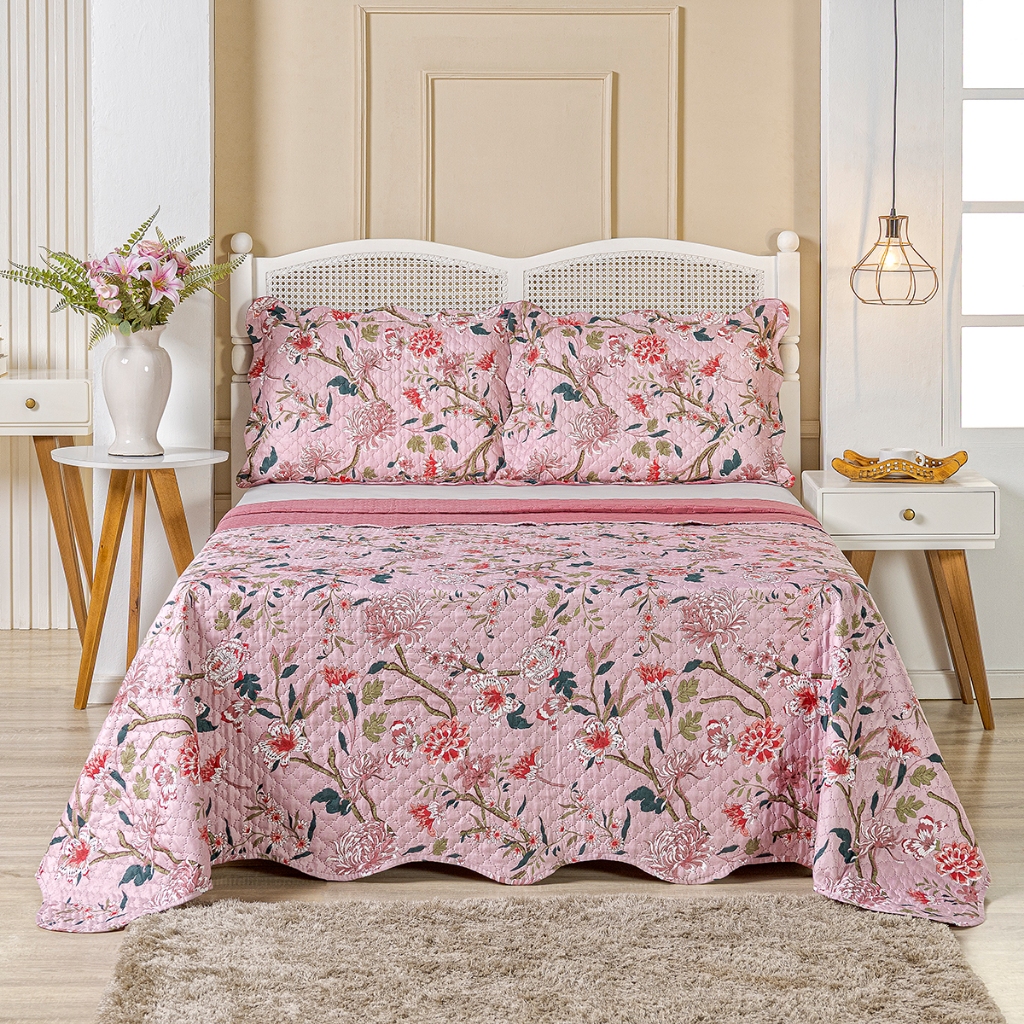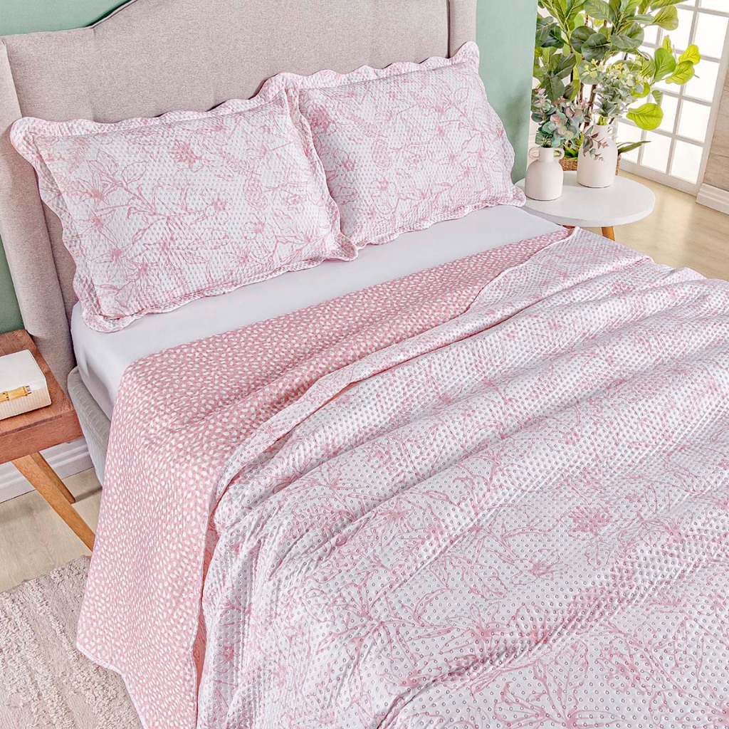 Kit Cobre Leito Colcha Queen Bouti 3 Peças Dupla Face Estampada Porta Travesseiro Aba Americana
