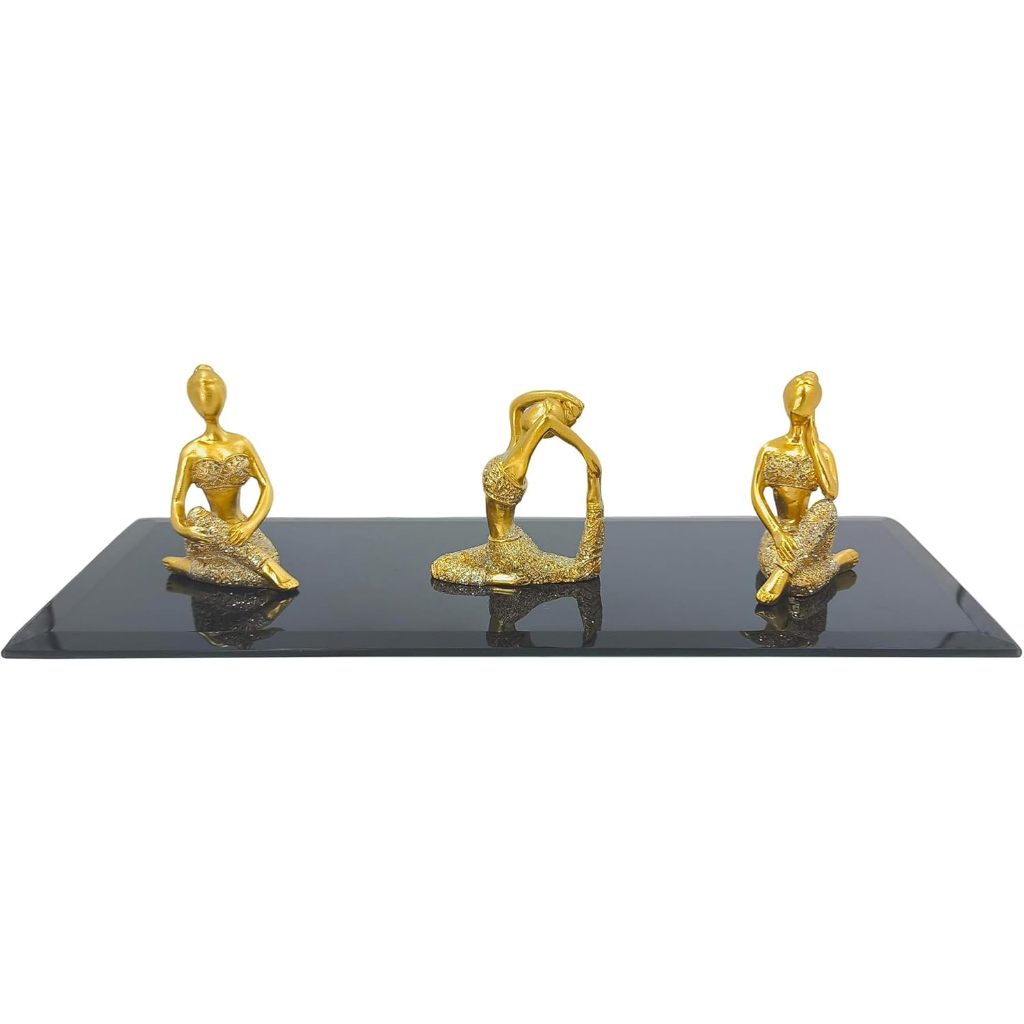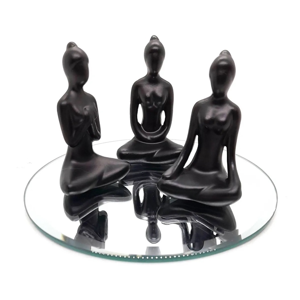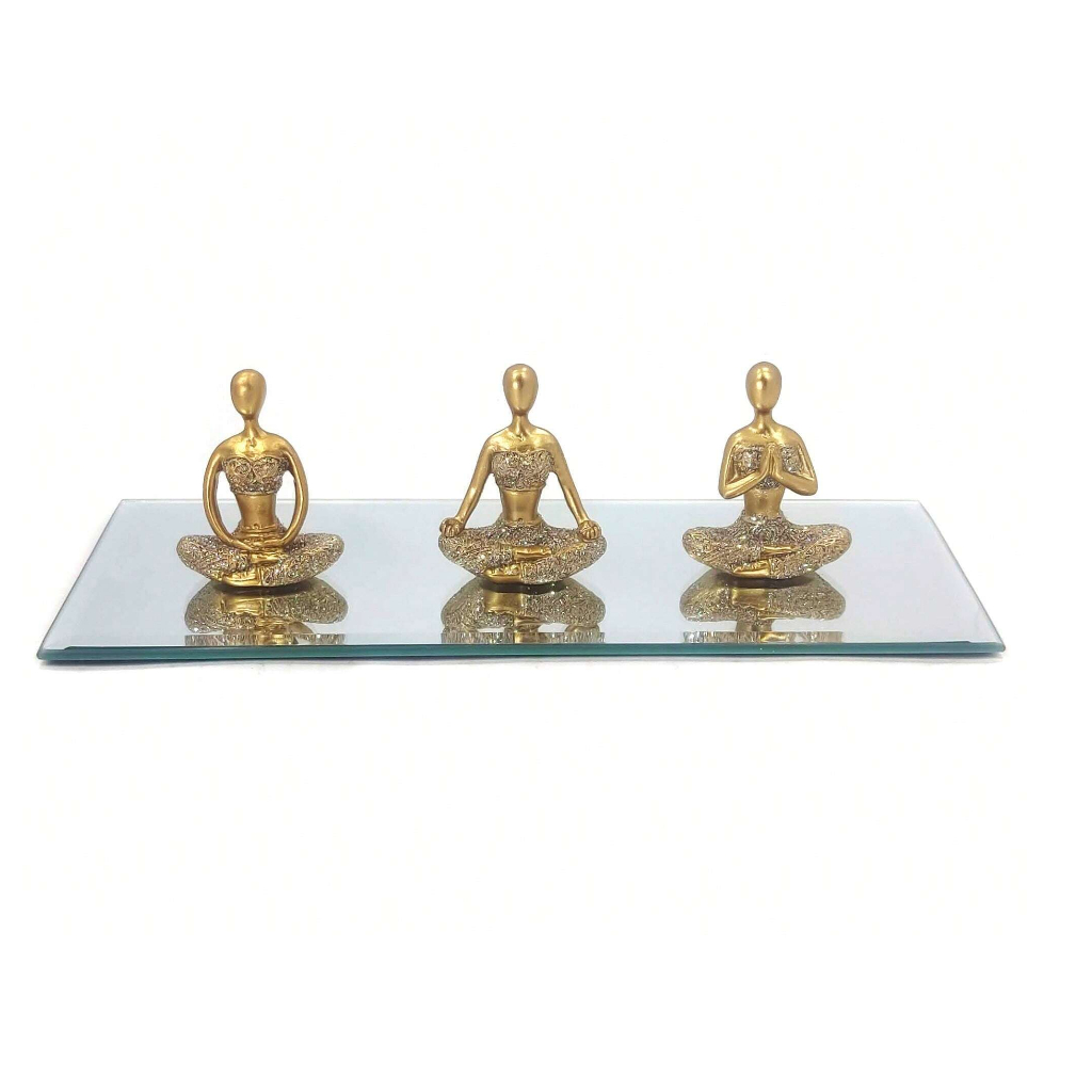 Kit Com 3 Estátuas Enfeite Decorativo Meditação Posições De Yoga 6cm + Bandeja Espelhada