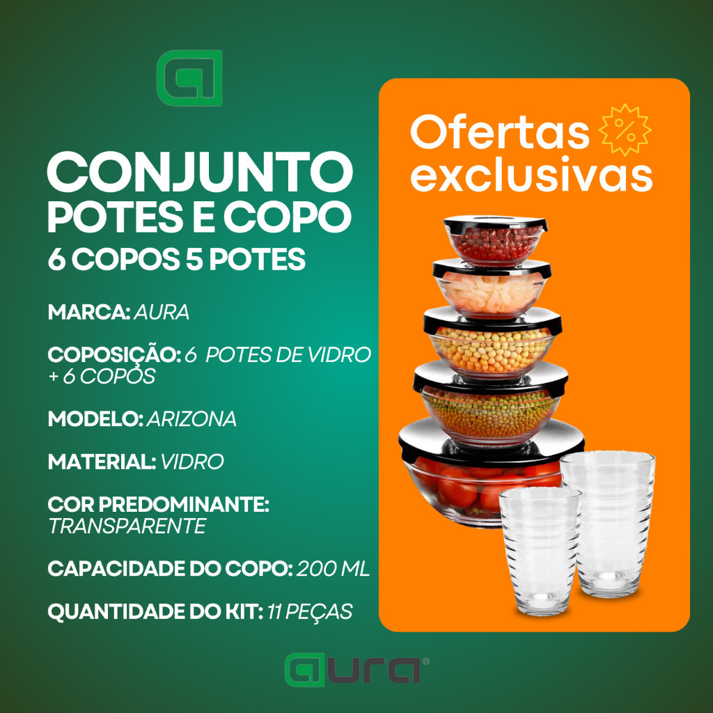 Kit Conjunto De Potes 5 Peças Vidro e 6 Copos Arizona 200ml Transparente