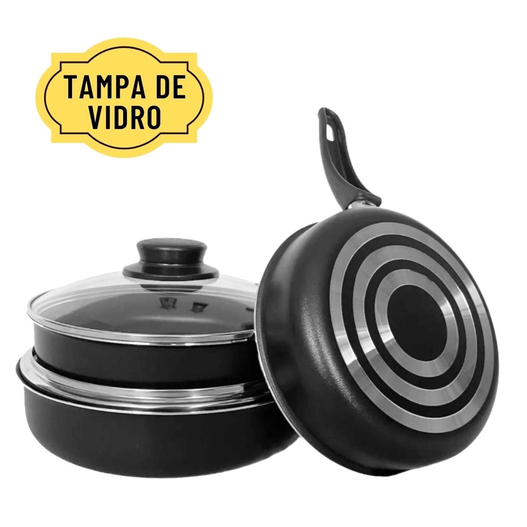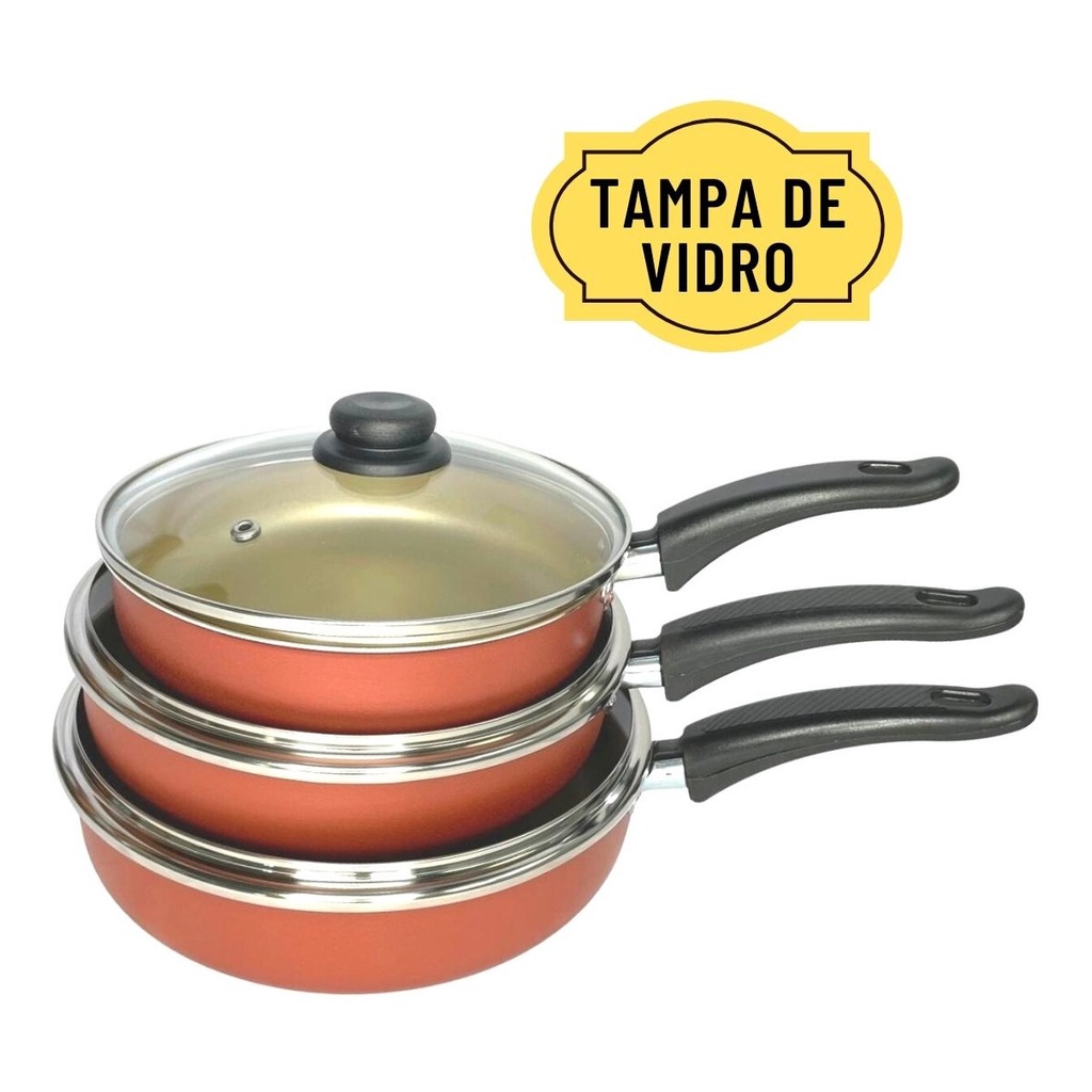 Kit Conjunto Frigideira Antiaderente Com Tampa De Vidro Jogo com 3 Peças Teflon