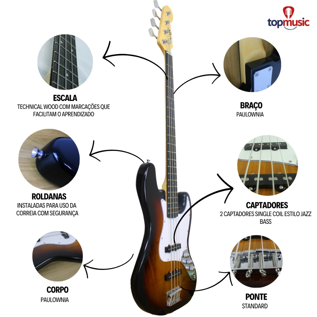 Kit Contra Baixo Bravo 4 Cordas Bb100 Passivo Jazz Bass + Acessórios
