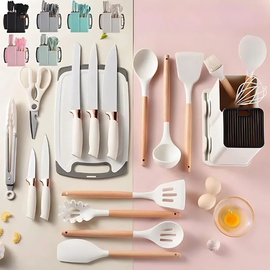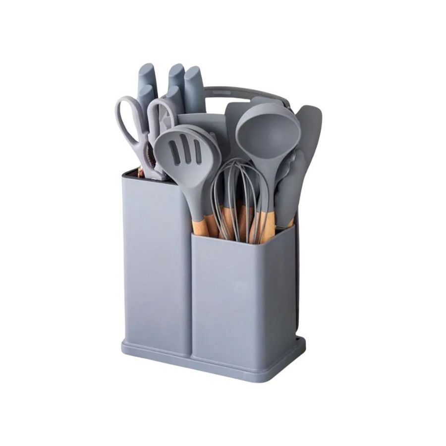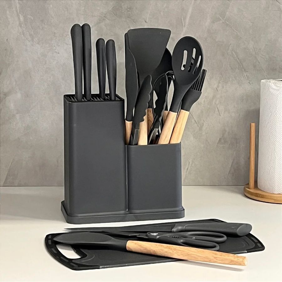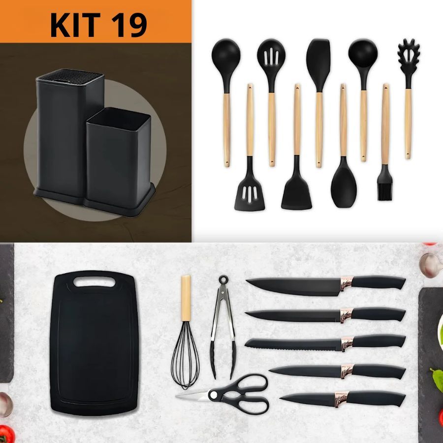 Kit Cozinha 19 Peças Silicone Antiaderente Facas Inox Madeira com Suporte