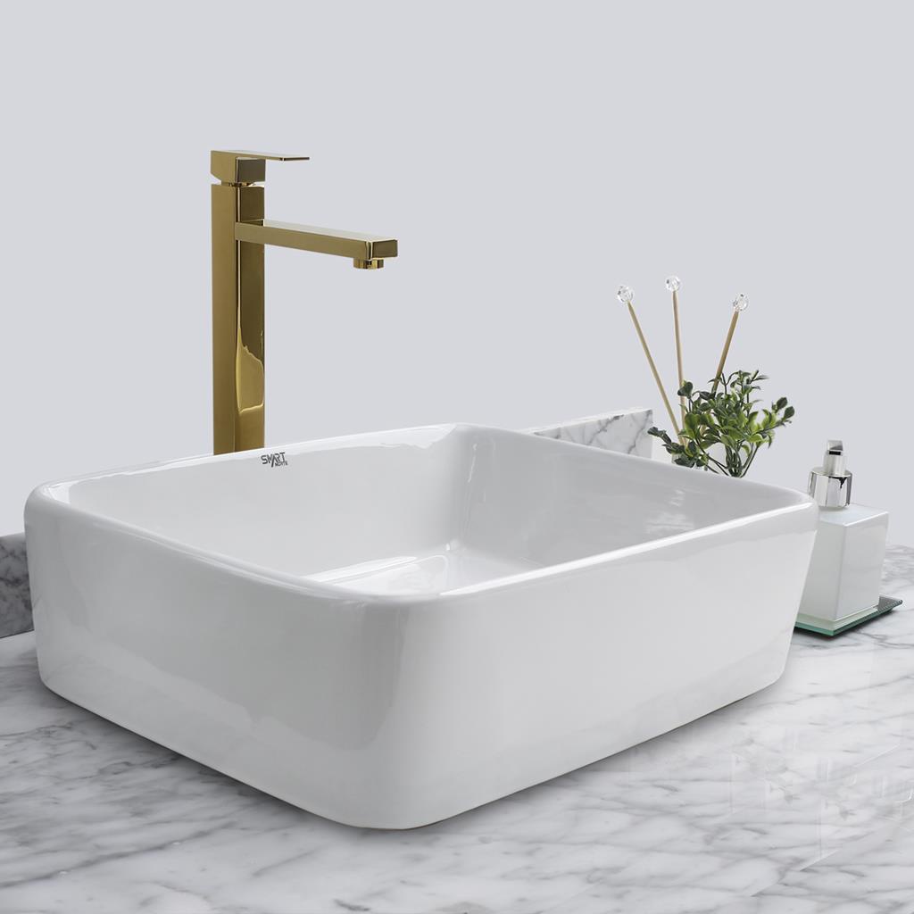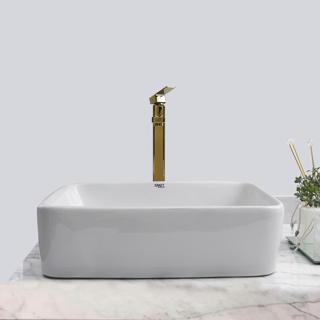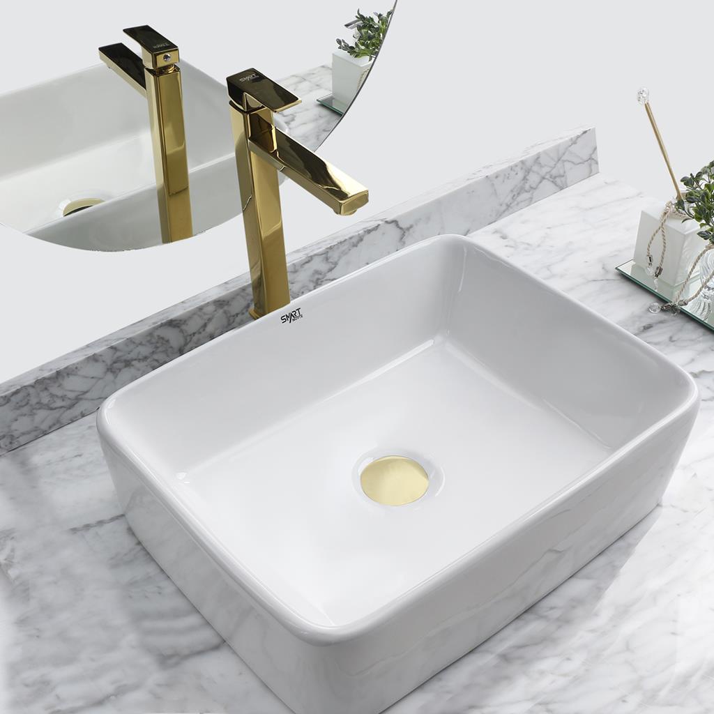 Kit Cuba Pia Louca Cerâmica Banheiro Com Torneira e Válvula Dourada 3