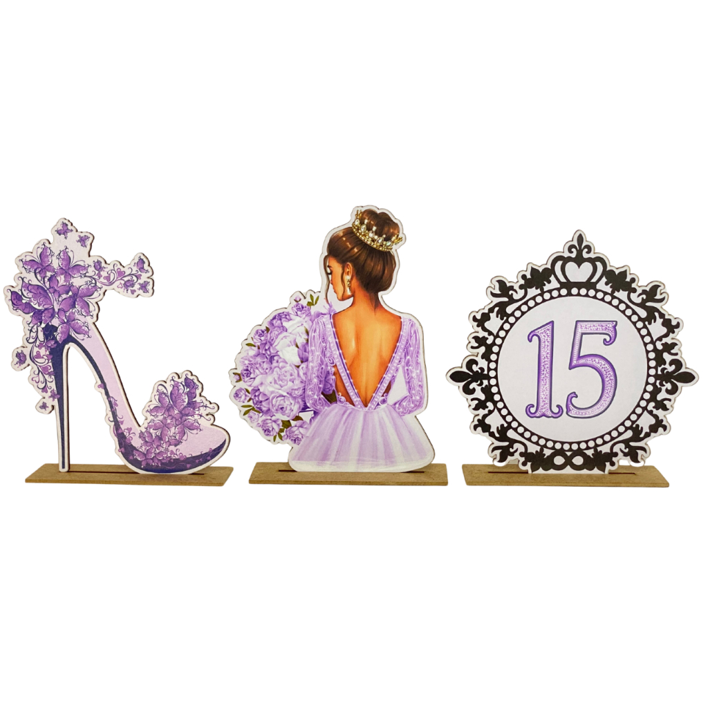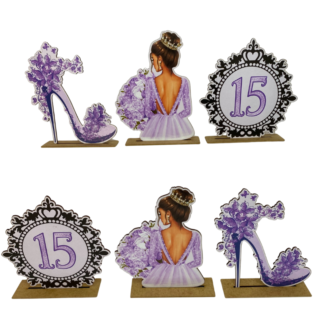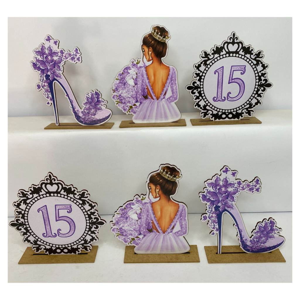 Kit Display de Mesa 6 Peças Para Festa 15 Anos Debutante Lilas/Lilas/Cast MDF