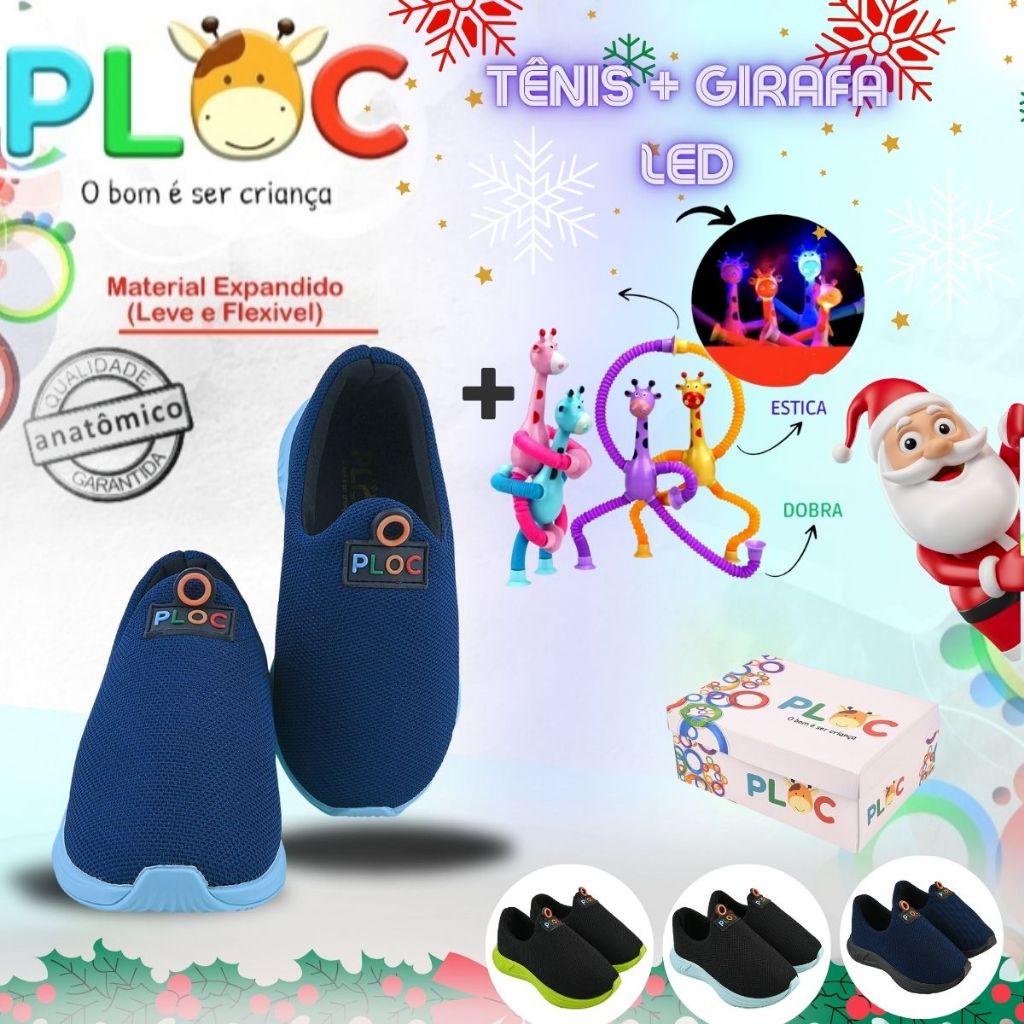 Kit Divertido Ploc - Tênis Calce Fácil Anatômico+ Girafa Ploc LED Estica e Puxa Menino