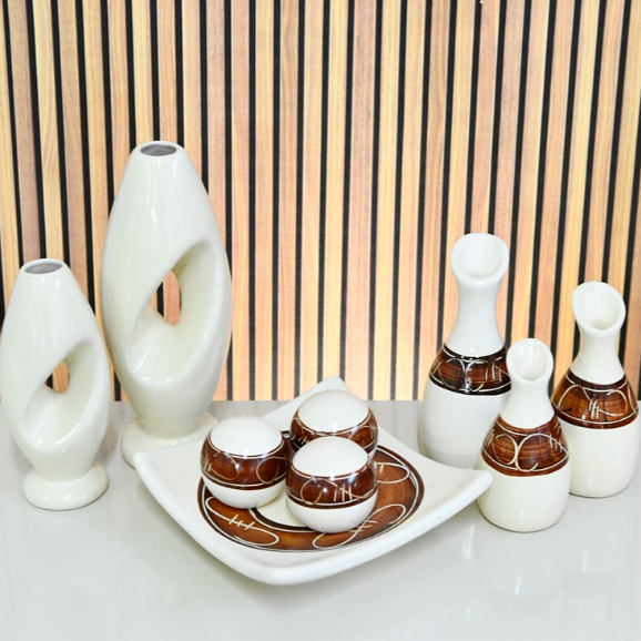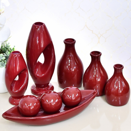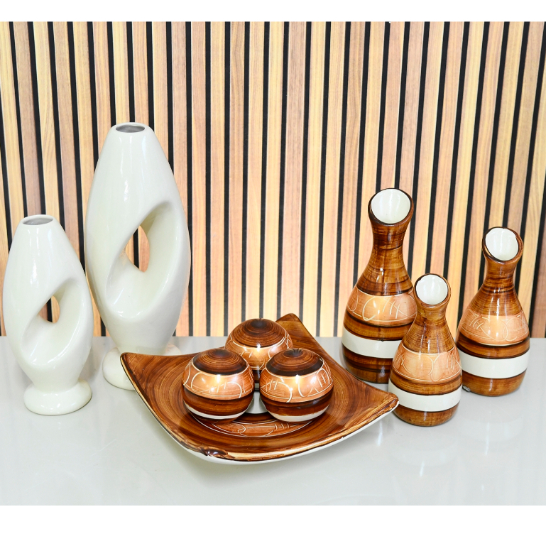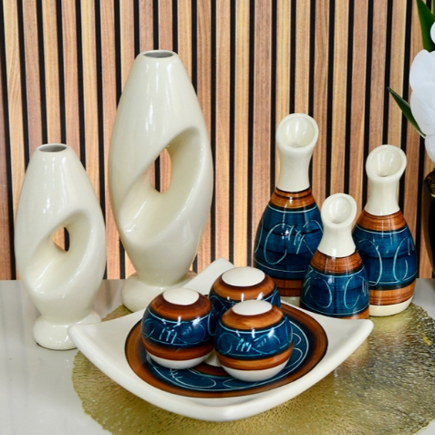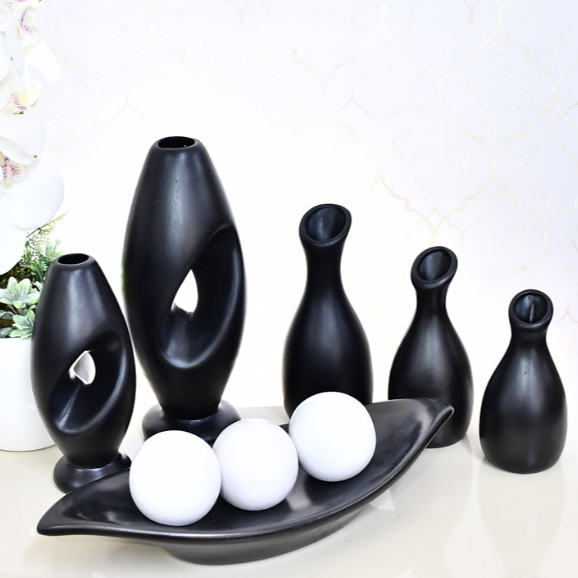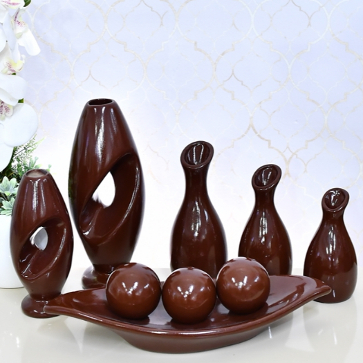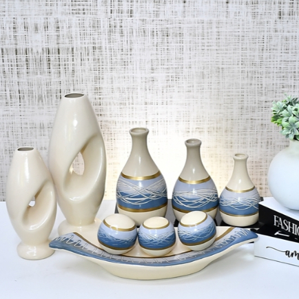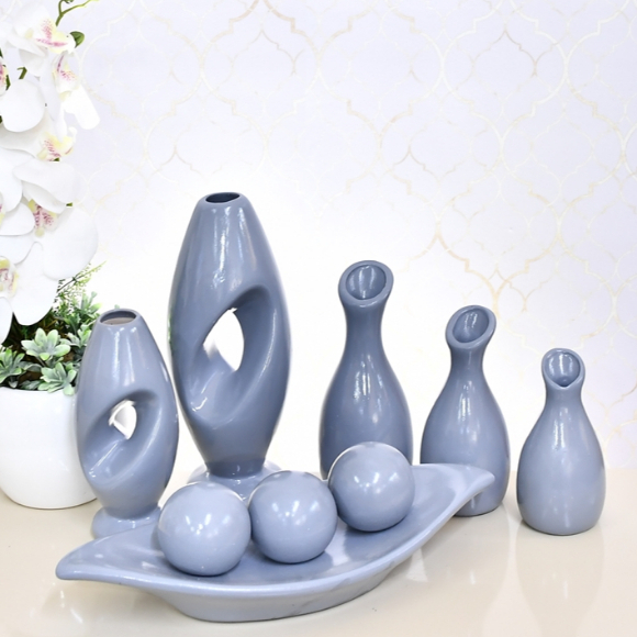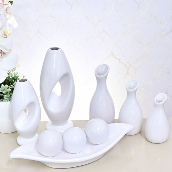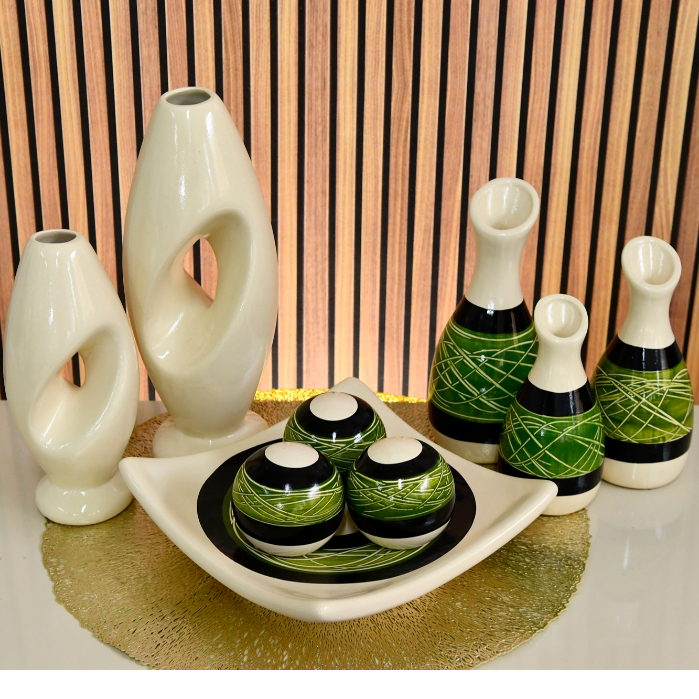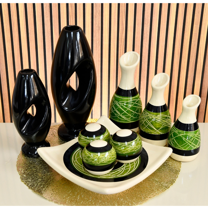 Kit Enfeite 9 Peças Vasos Cerâmica Sala Conjunto Completo Decorativas Trio Rack Centro Mesa Cozinha