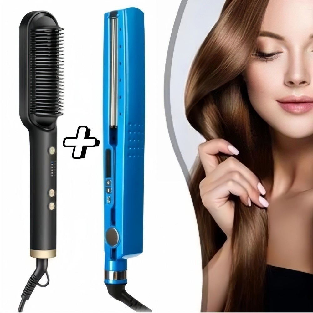 Kit Escova Alisadora Bivolt 5 em 1 + Chapinha de Cabelo Nano Titanium 450° - WL