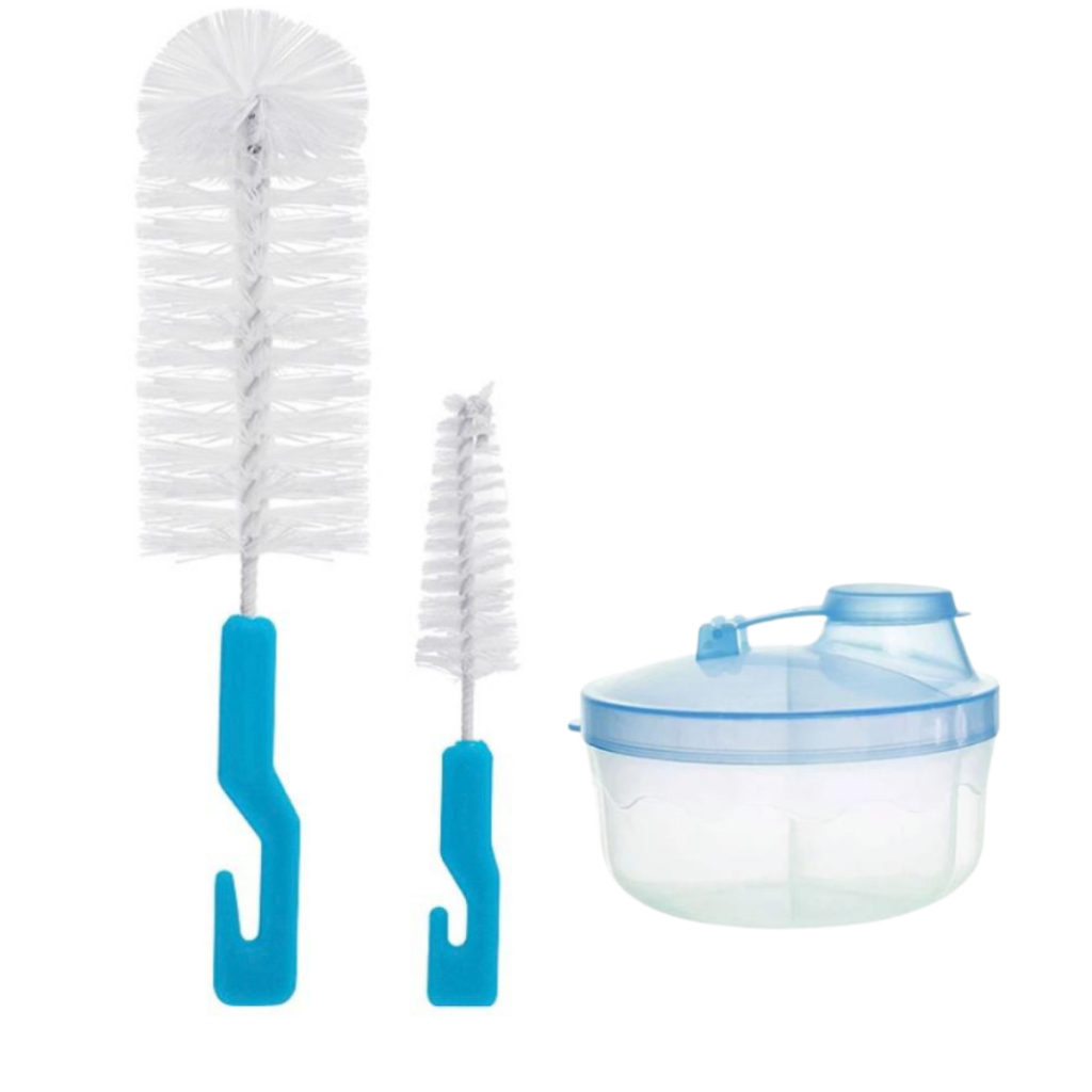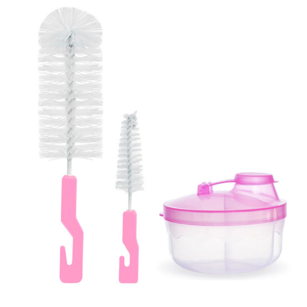 Kit Essencial 2 Escovas de Mamadeira + Porta Leite em Pó Para Bebê