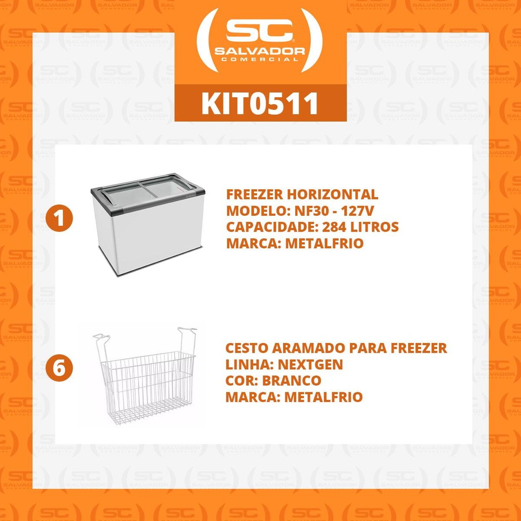 Kit - Freezer Horizontal Tampa de Vidro 231/292 Litros Nf30 - Metalfrio 127v + 6 Cestos Nextgen Branco