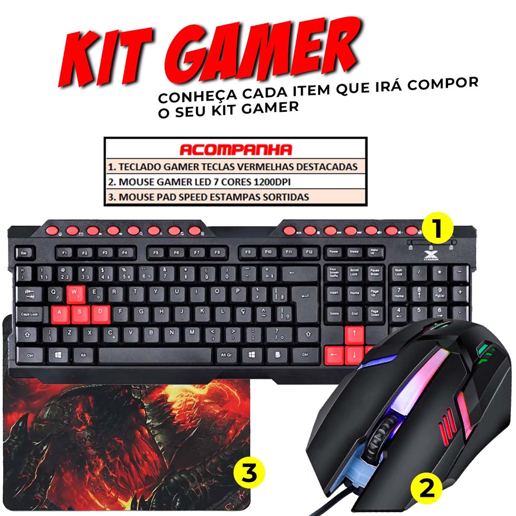 Kit Gamer com Teclado ABNT2, Mouse LED 1200 DPI e Mousepad Estampado