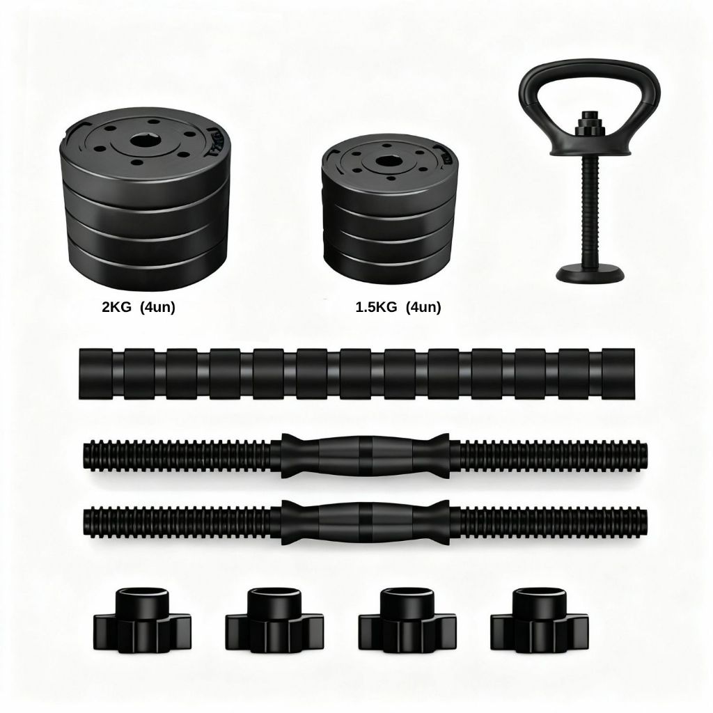 Kit 15kg - Halteres, Anilhas, Barras e kettlebell Ajustáveis - Treino em Casa Musculação